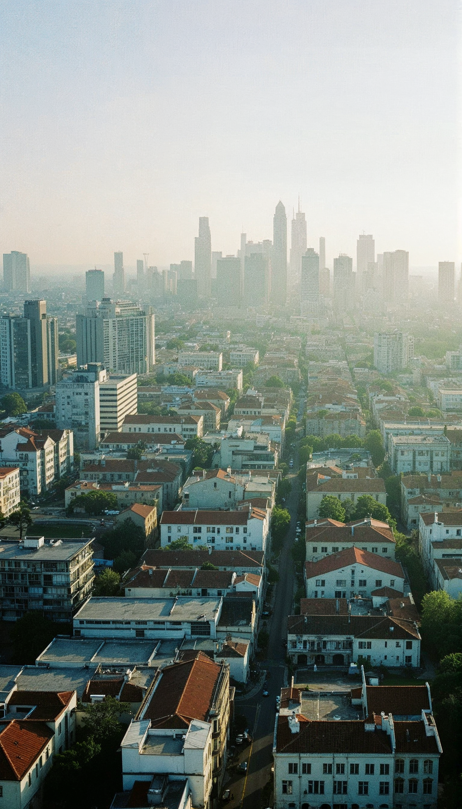 Aerial view of a cityscape with red-tiled roofs and modern skyscrapers under a clear sky.