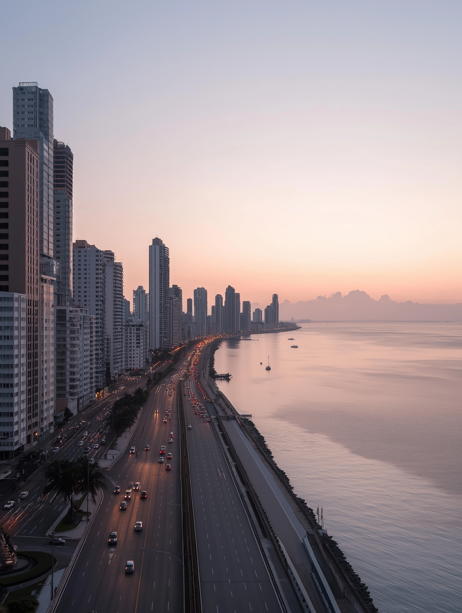 Beautiful coastal cityscape at dusk with skyscrapers, a busy highway, and serene sea reflecting pastel sunset hues.