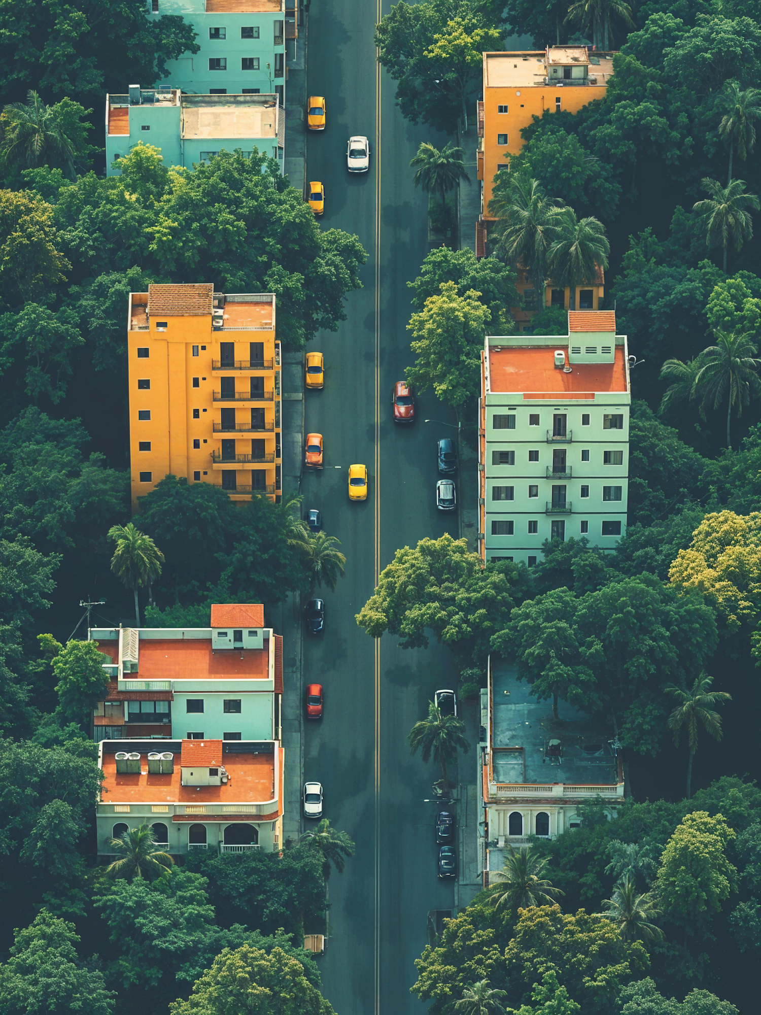 Aerial view of a vibrant city street with colorful buildings, lush trees, and various cars, including yellow taxis, creating a lively scene.