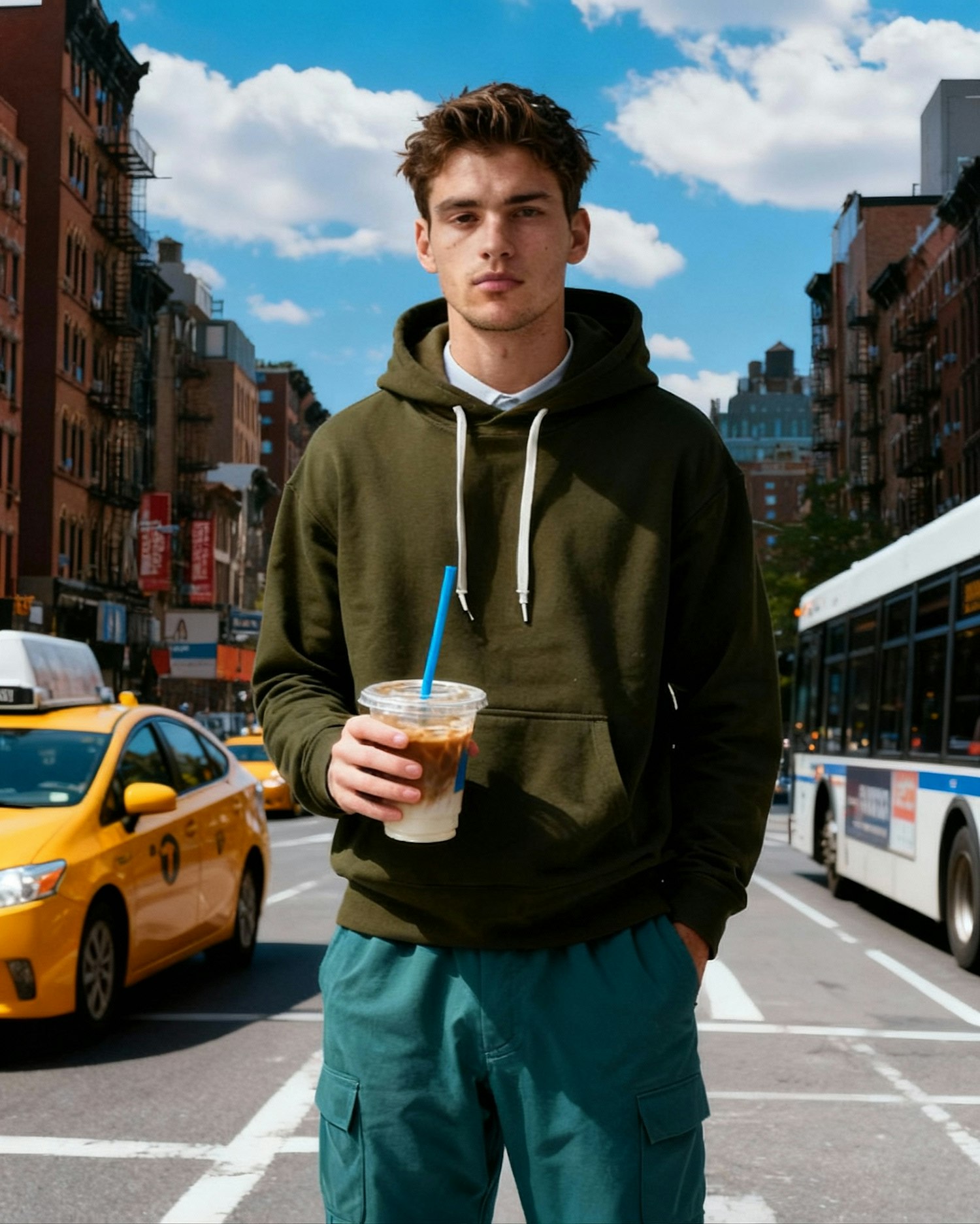 A young man in a green hoodie and teal pants holds iced coffee on a busy city street with taxis and a bus in the background.
