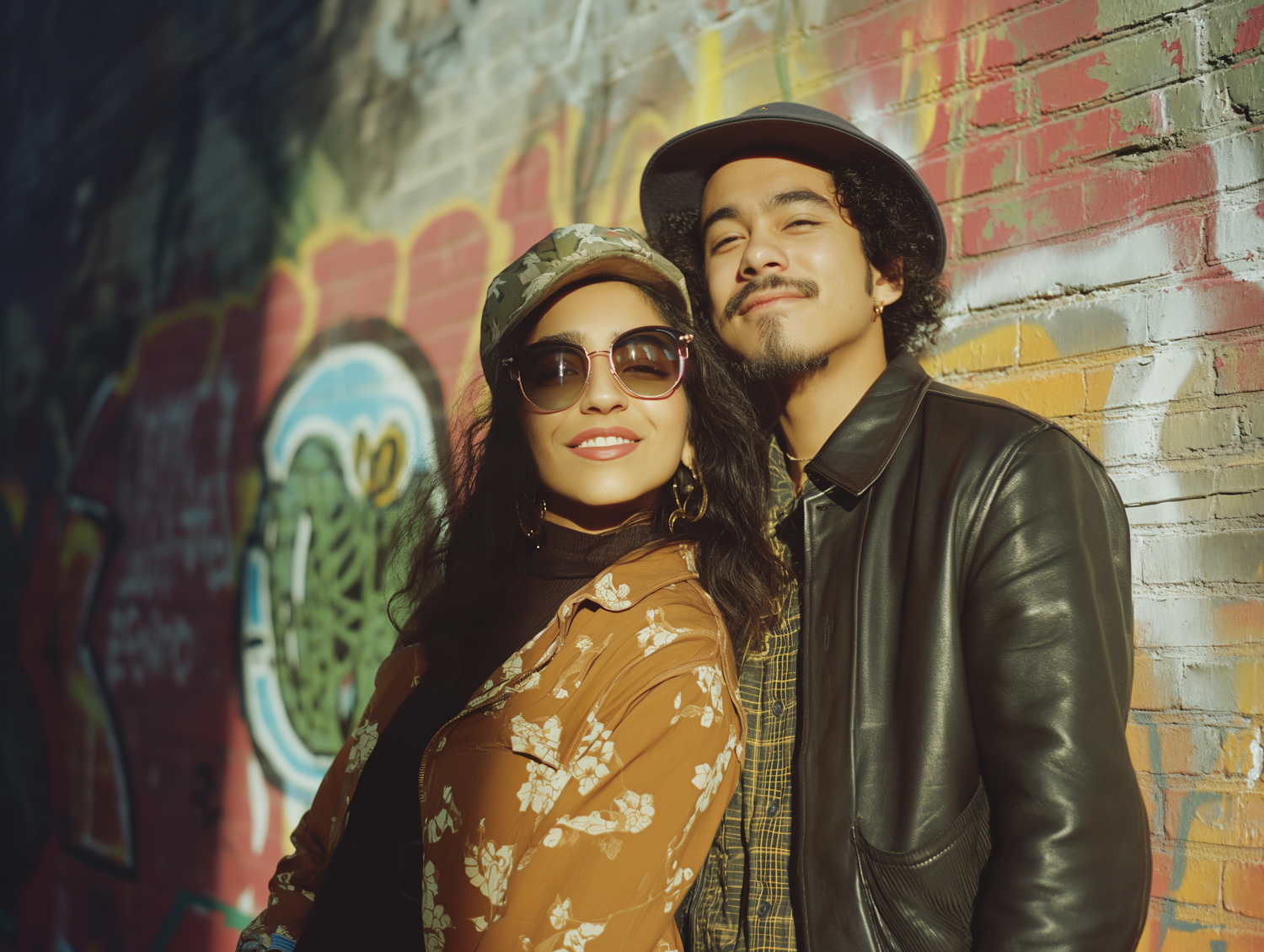 Couple in stylish outfits poses against a colorful graffiti wall, creating a vibrant urban scene with warm lighting and artistic flair.