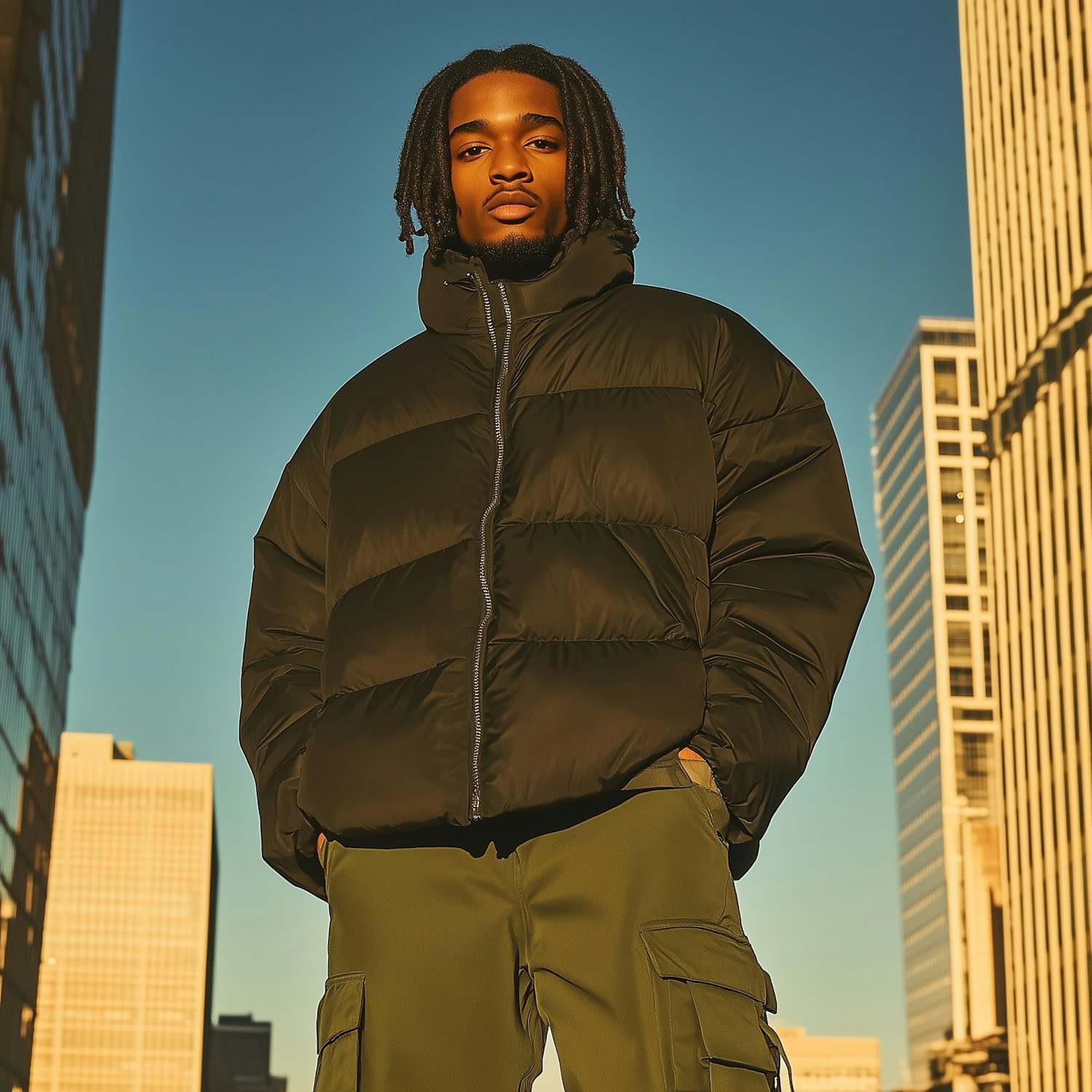 Stylish man in a black puffer jacket and olive cargo pants stands in a sunlit urban setting with modern skyscrapers in the background.