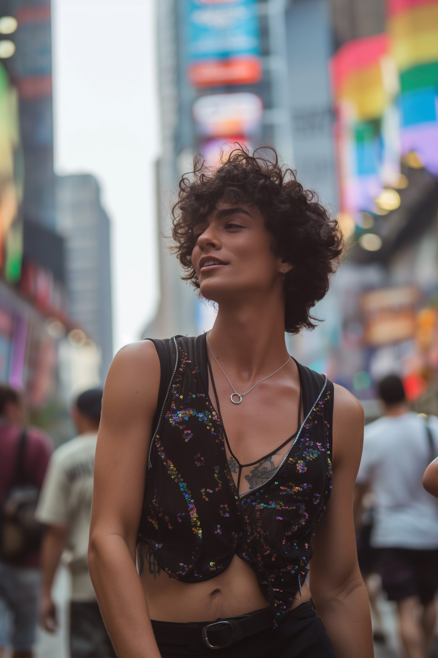 Confident individual with curly hair in a sequined top amidst vibrant city lights, exuding freedom and style.