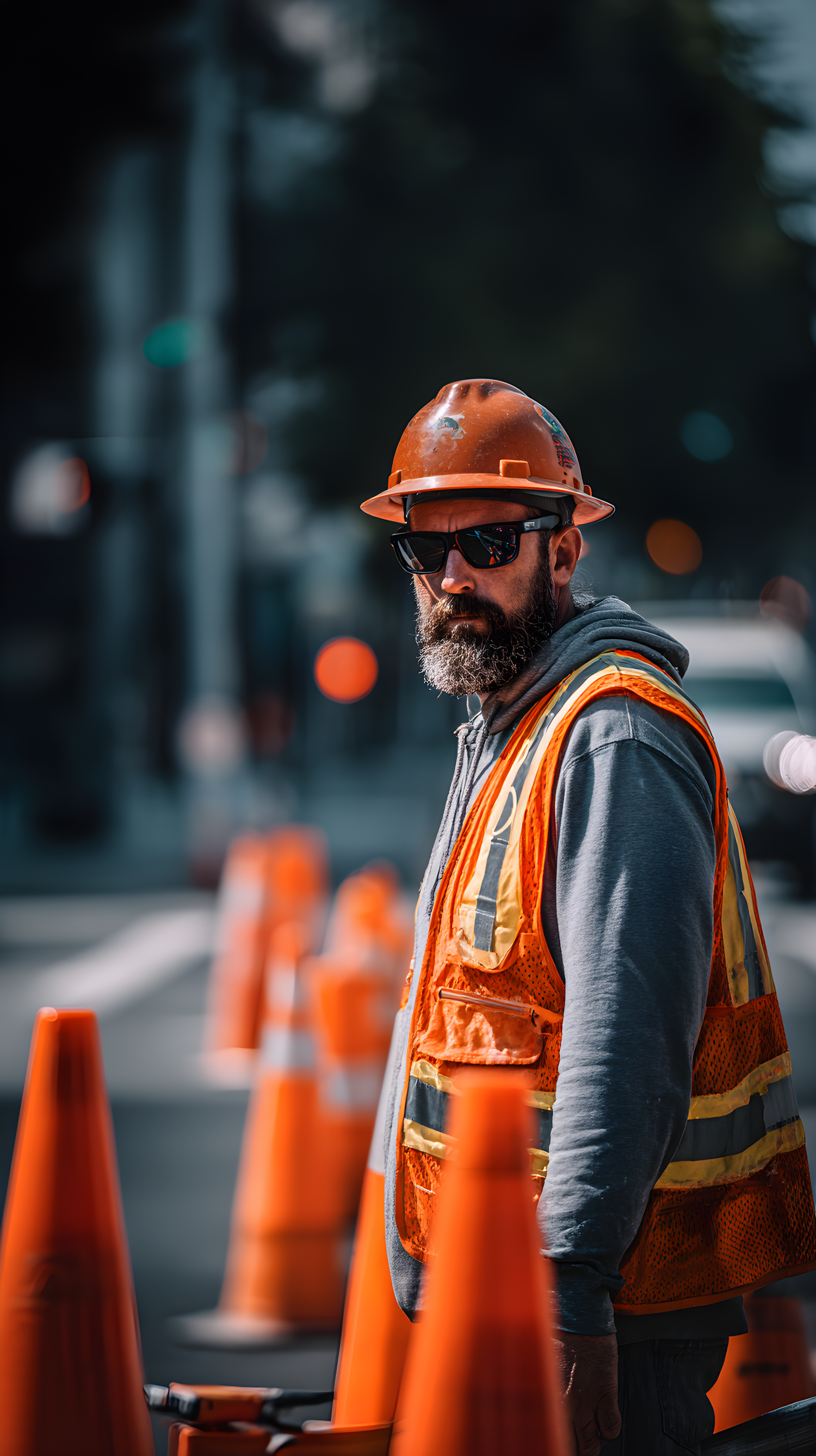 A construction worker in safety gear stands among traffic cones on a city street, showcasing urban work environments.