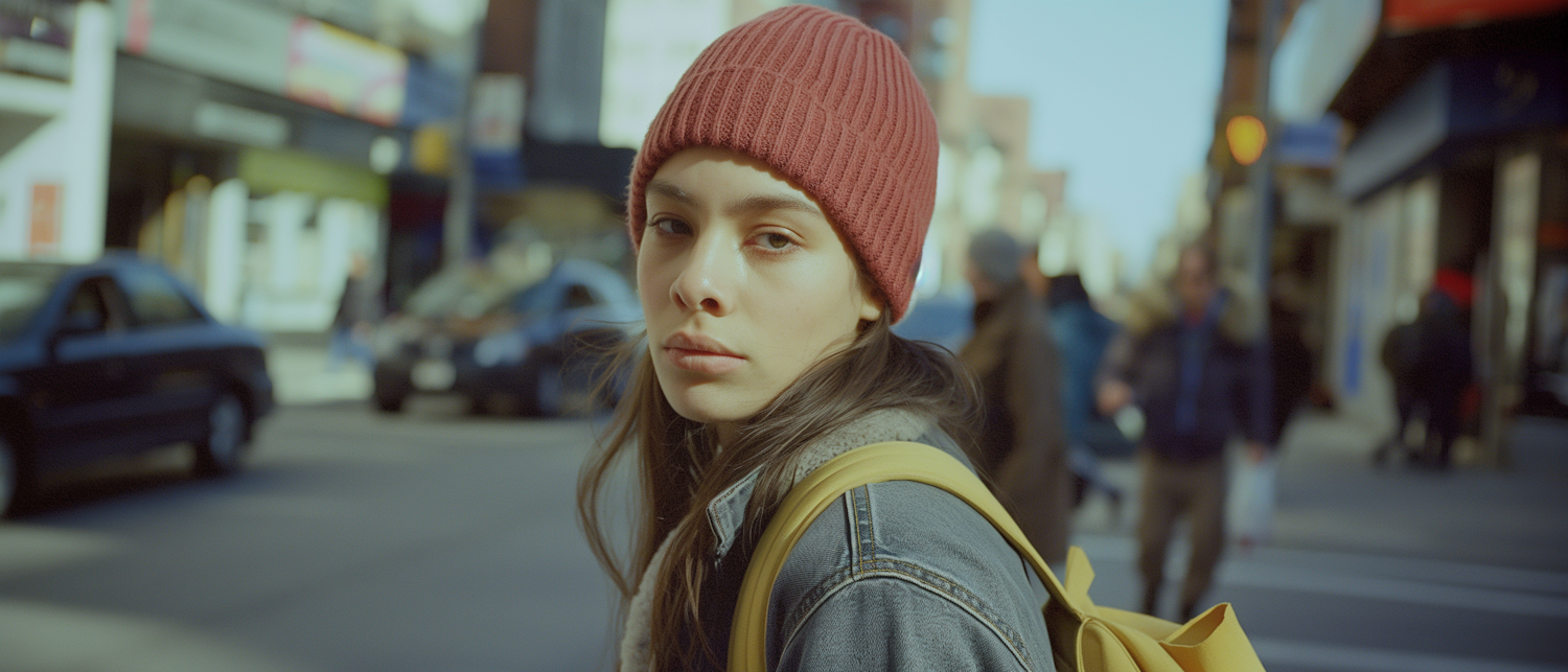 Young woman in a red beanie and denim jacket on a city street, carrying a yellow backpack. Urban scene with cars and pedestrians.