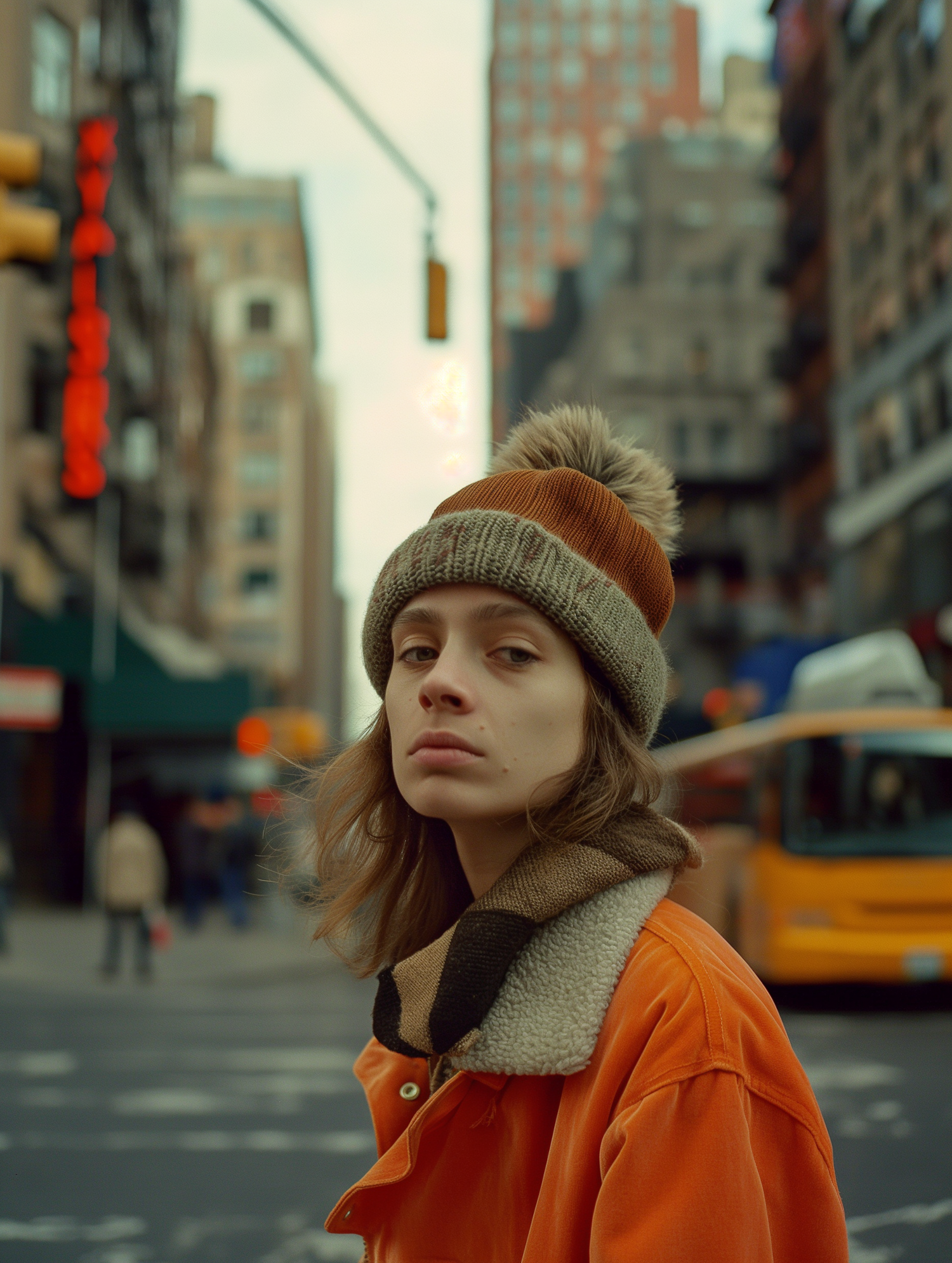 Young woman in orange jacket and beanie on a city street, with a yellow taxi in the background, capturing urban autumn vibes.