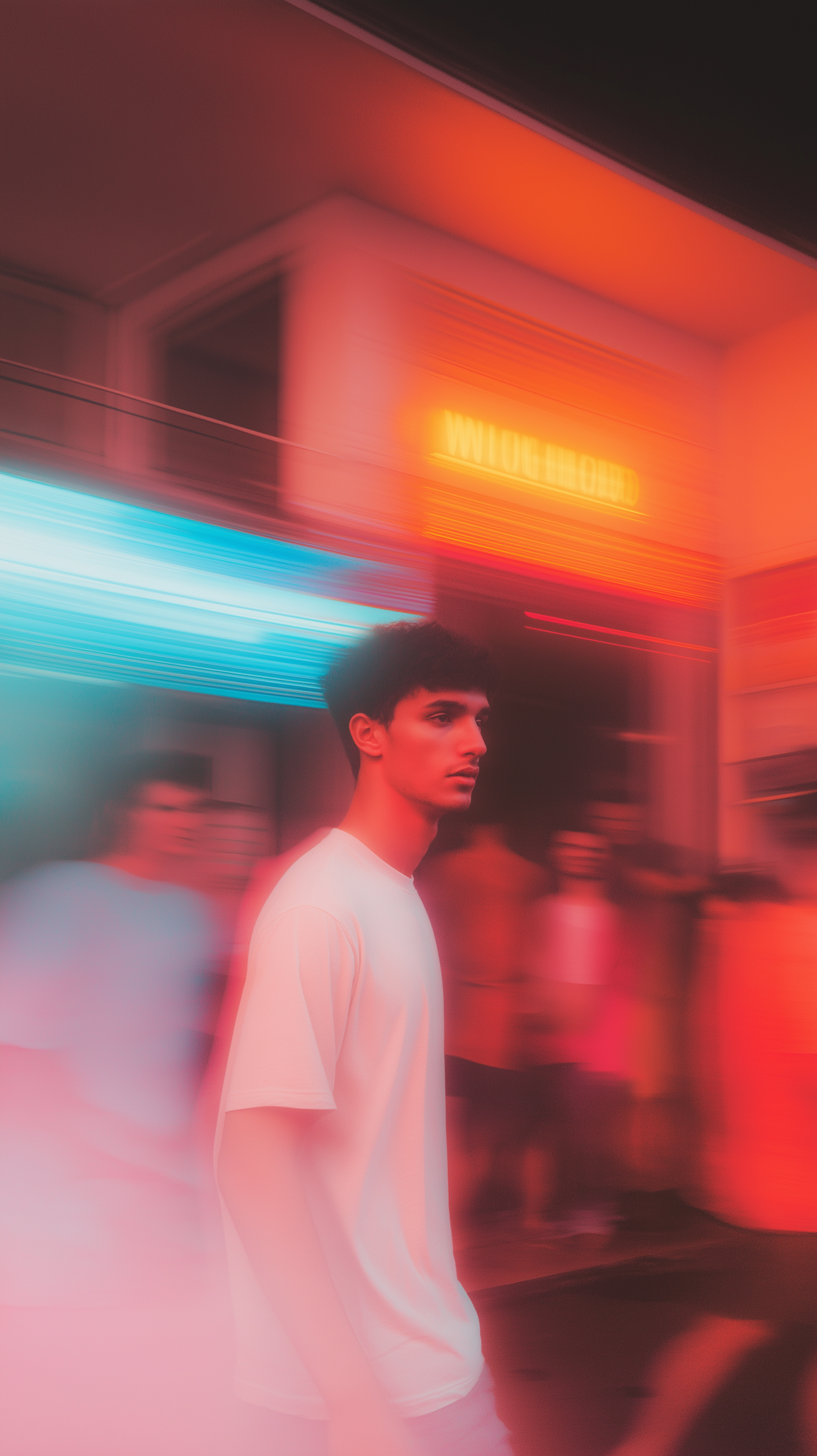 Young man in a white t-shirt amidst a vibrant, blurred urban scene with neon lights and motion, creating a dreamlike atmosphere.