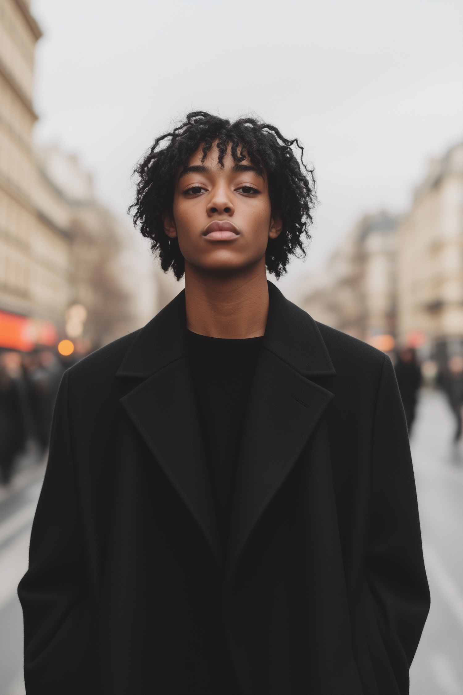 Stylish young man in a black coat stands confidently on a bustling city street, exuding modern urban fashion.