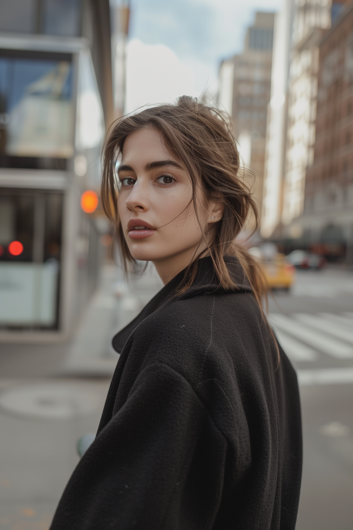 Young woman with brown hair in a black coat on a city street, gazing at the camera with a neutral expression.