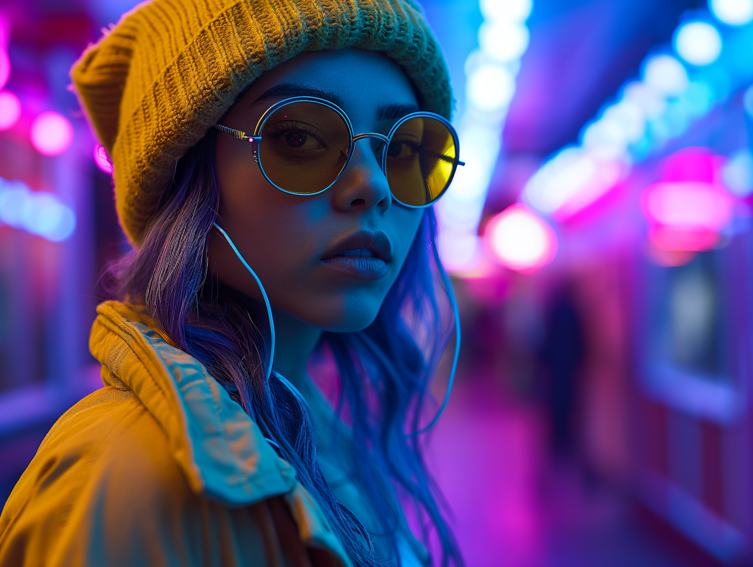 Stylish woman with purple hair and yellow accessories in a neon-lit setting, exuding a retro vibe with vibrant colors.
