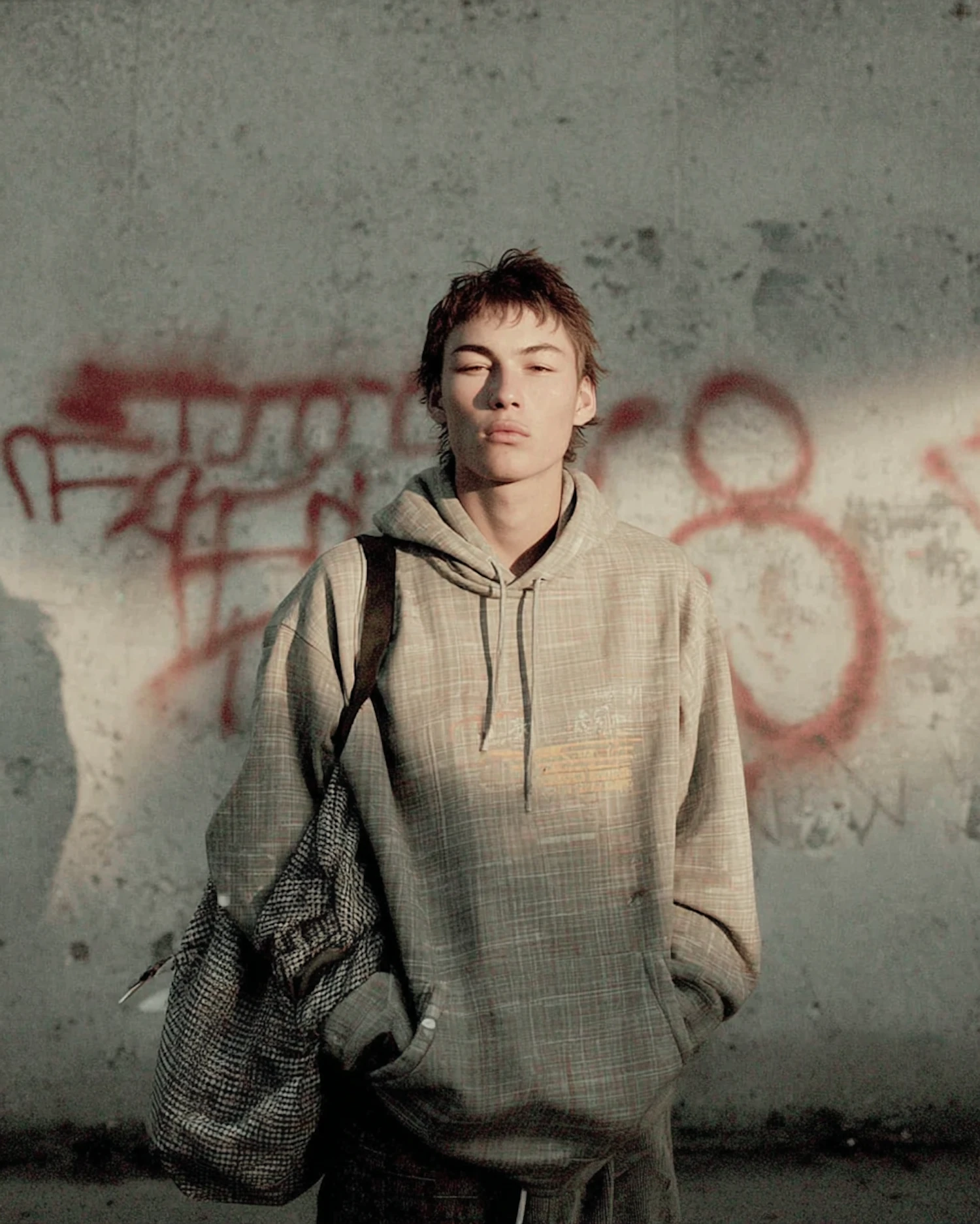A young person in a plaid hoodie stands against a graffiti-covered wall, carrying a patterned bag, in a softly lit urban setting.