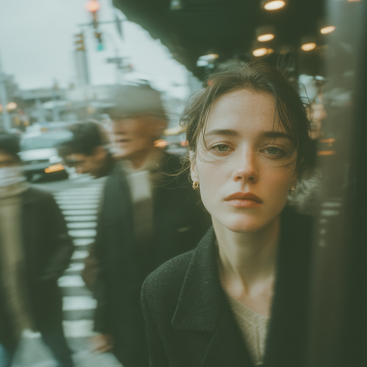 A contemplative woman in a dark coat stands amidst a blurred urban street scene, capturing a moment of stillness in motion.