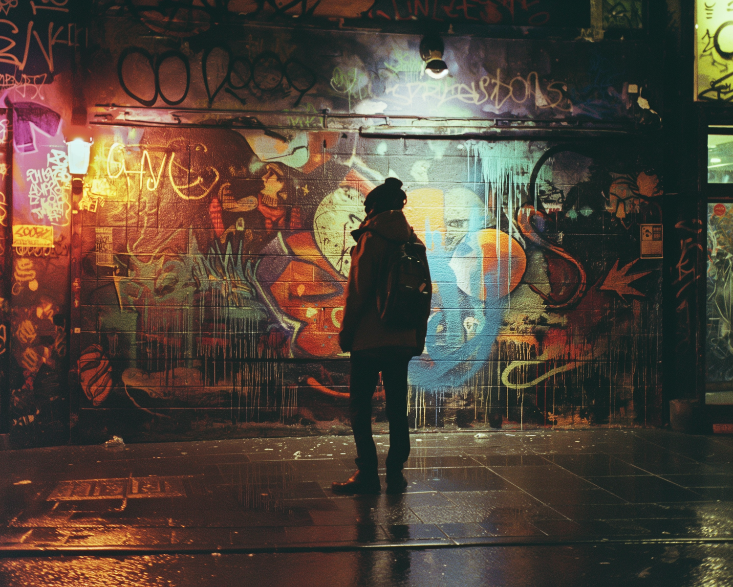 Silhouetted figure in front of a colorful graffiti wall at night, illuminated by warm streetlights and reflected on wet pavement.