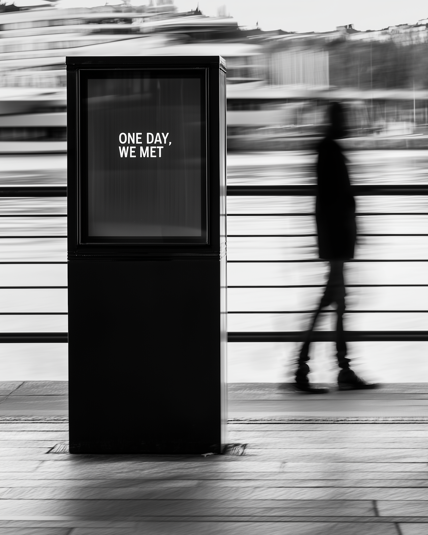 Black-and-white urban scene with a display reading "ONE DAY, WE MET" and a blurred silhouette walking by, evoking a reflective mood.