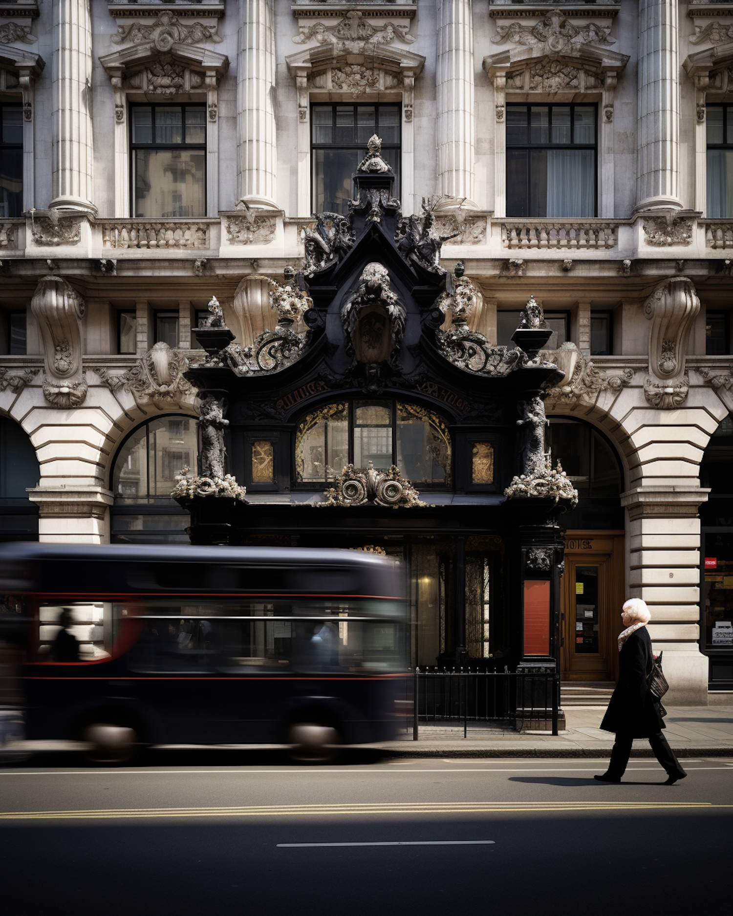 Ornate building facade with a blurred double-decker bus and a woman walking, capturing dynamic urban life.