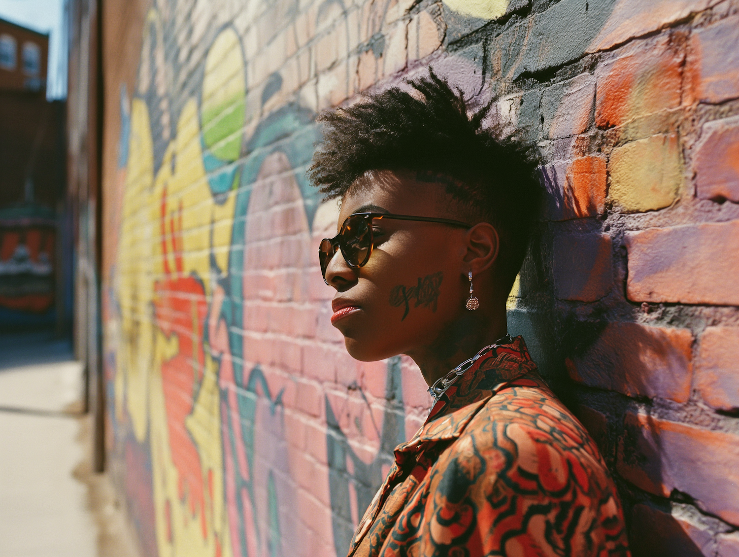 Stylish individual with sunglasses and tattoo leans against a vibrant graffiti wall in a sunlit urban alley.