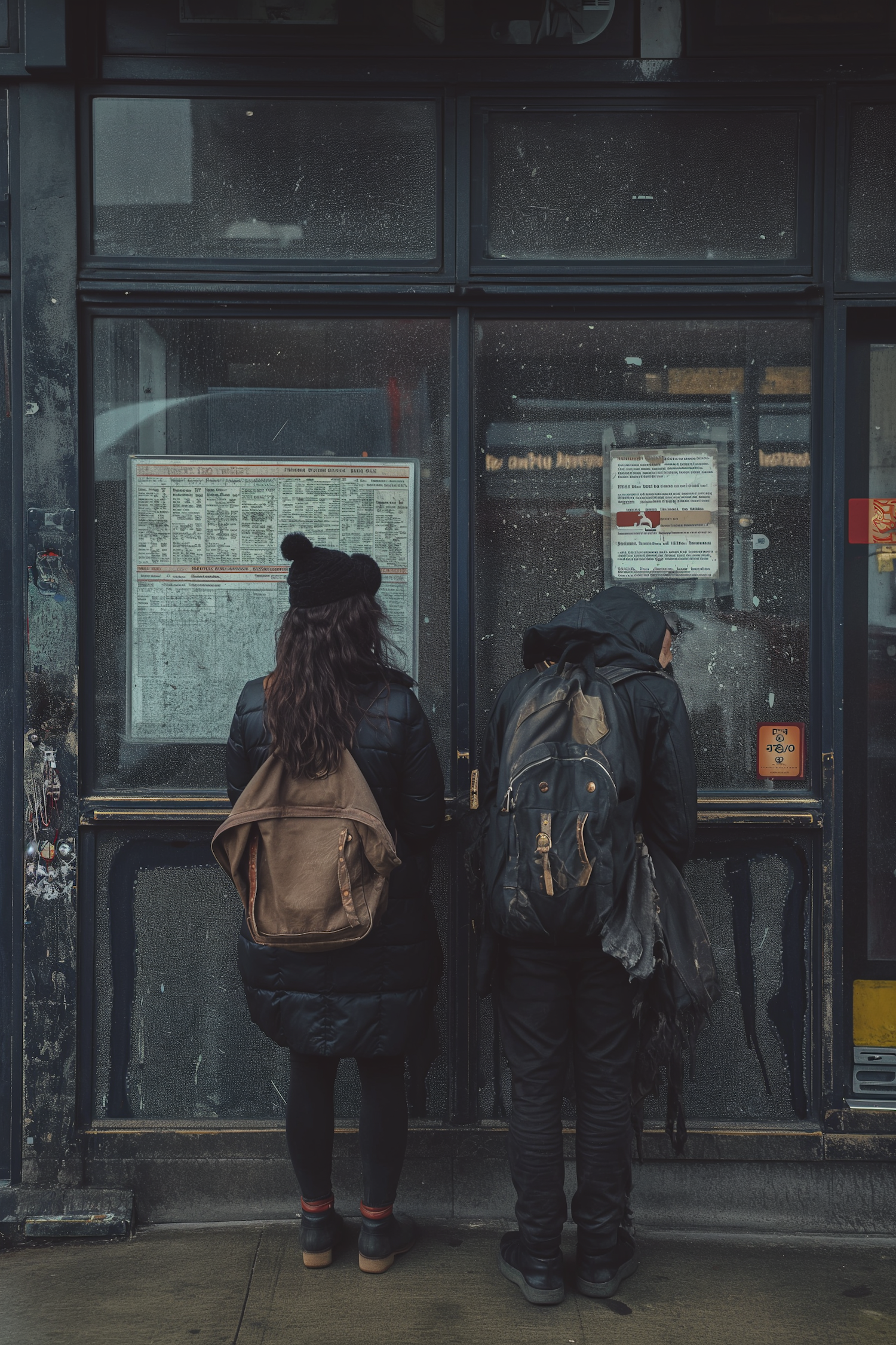 Two people in dark clothing examine a schedule on a glass door, urban setting, backpacks, rainy day.