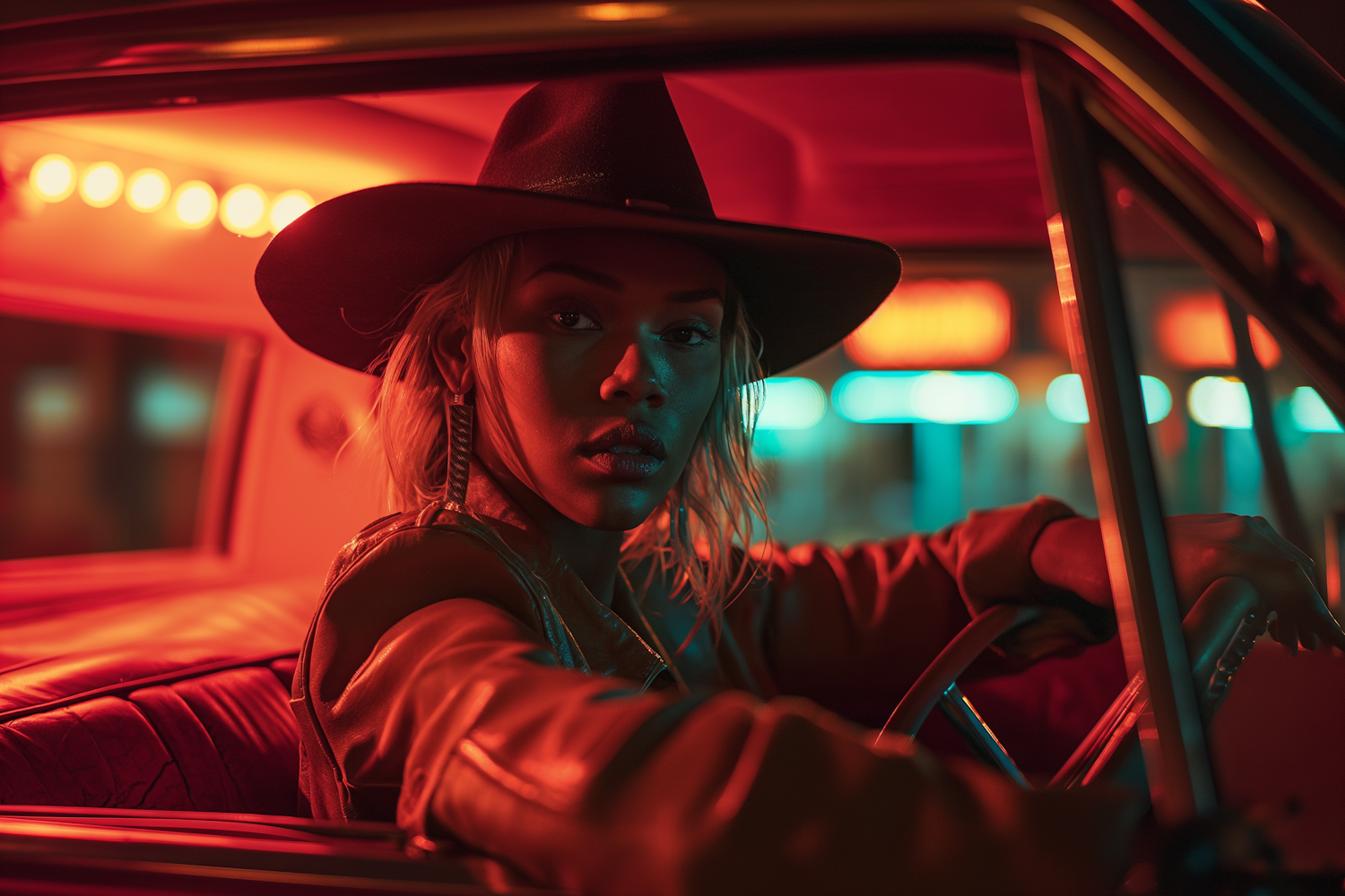 Stylish person in a car with dramatic red lighting, wearing a black hat and leather jacket, creating a cinematic urban vibe.