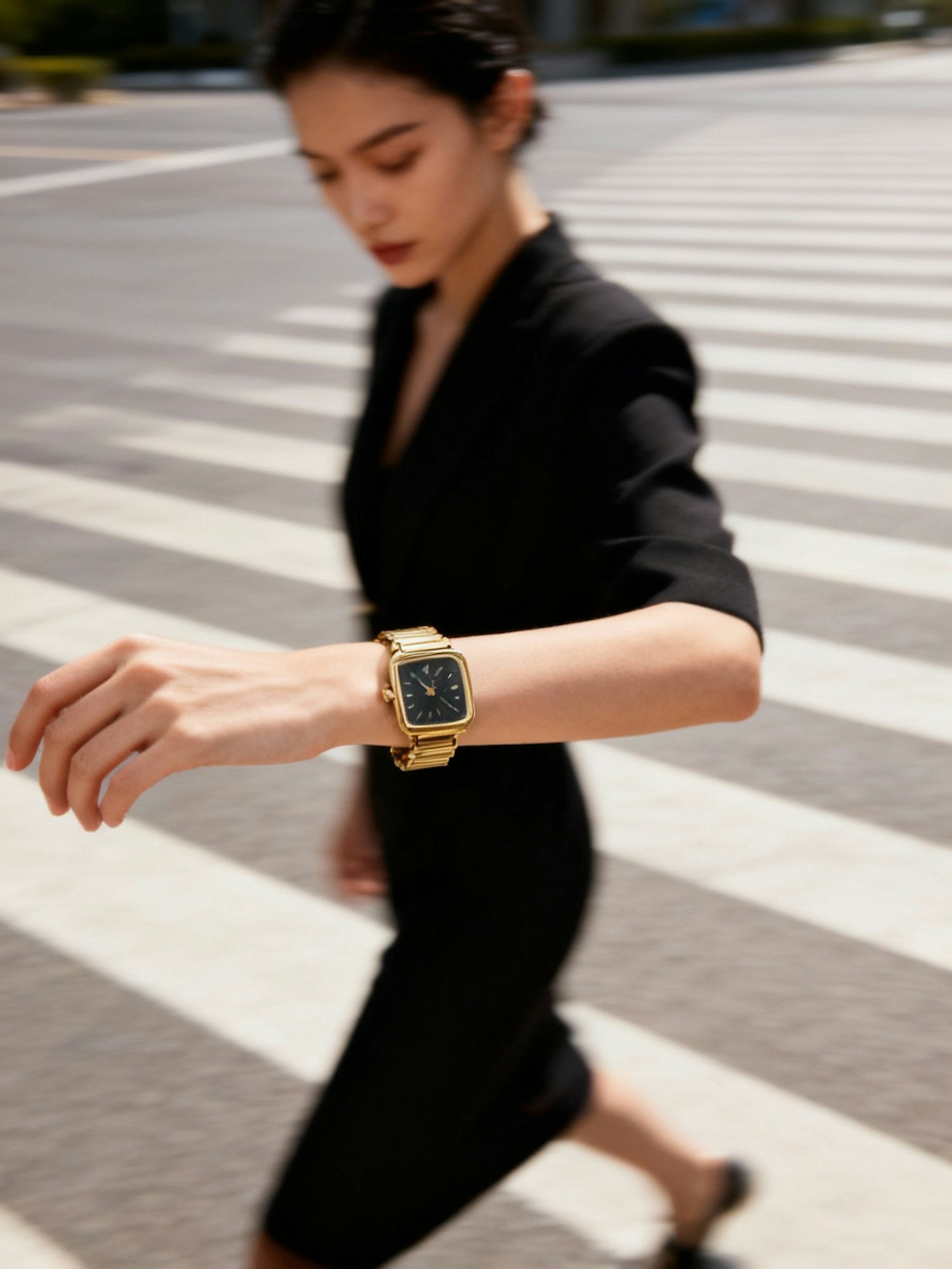 A stylish individual crossing a city street, wearing a sleek black outfit and a gold wristwatch, captured in a dynamic and modern setting.