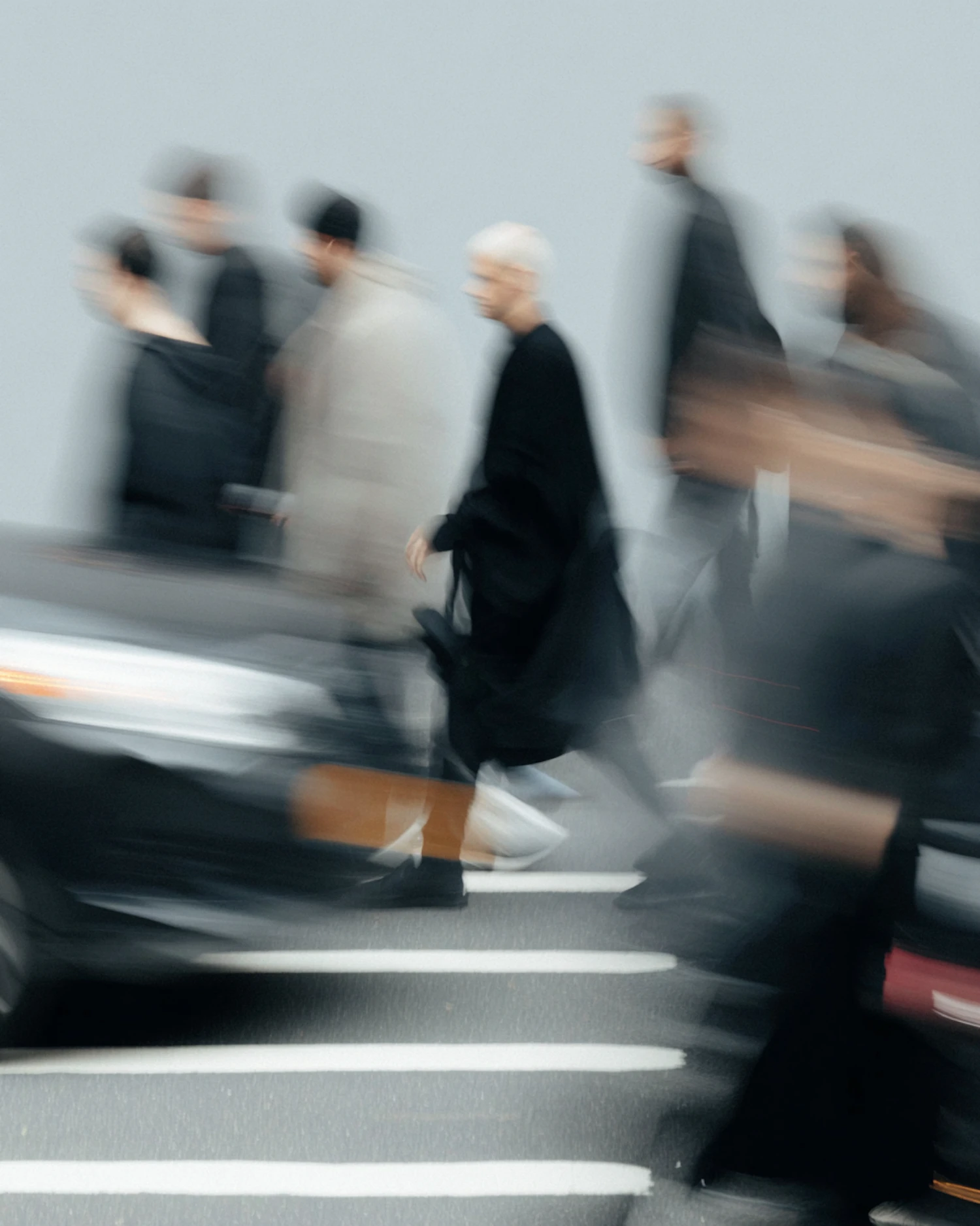 Blurred motion of pedestrians crossing a street, emphasizing urban life and movement with a modern aesthetic.