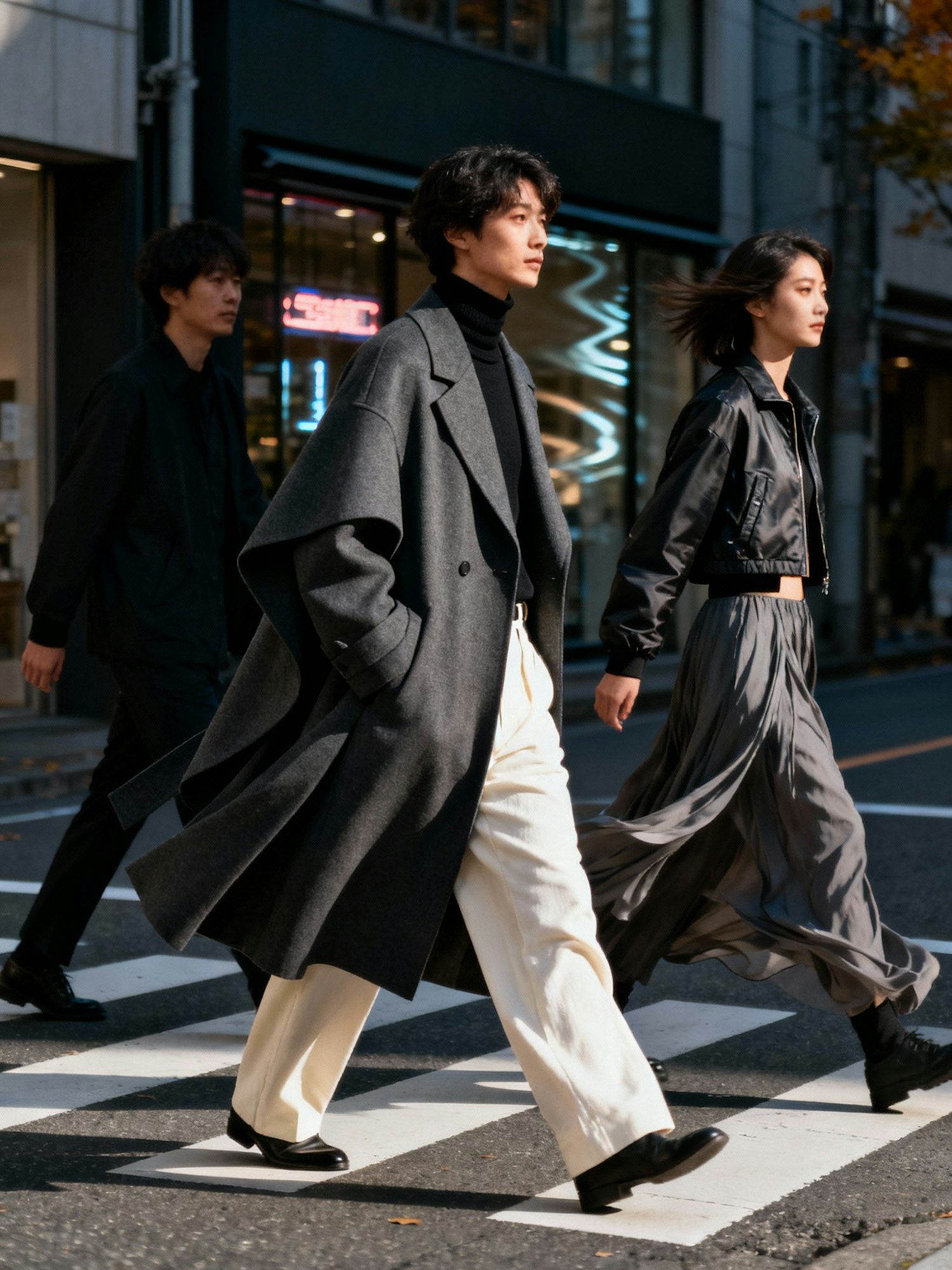 Three stylish individuals walk across a city crosswalk, showcasing modern fashion in an urban setting with illuminated storefronts.