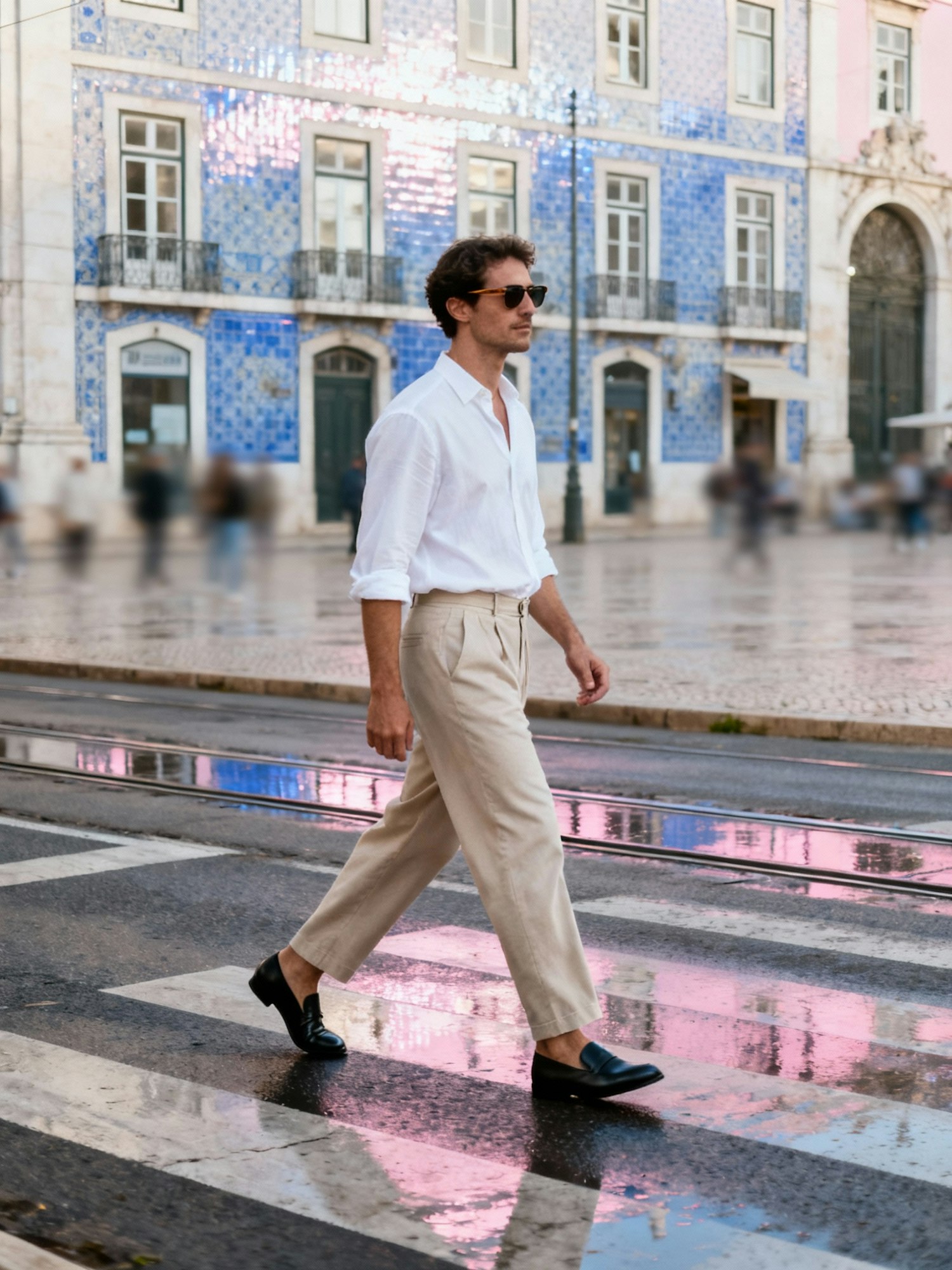 A realistic street-photography fashion image captured 'across the street' in Lisbon, spring 2025, late morning. A man in his early thirties crosses Praça Luís de Camões with effortless calm, dressed in minimalist layers — a crisp white cotton shirt tucked into loose beige trousers, finished with sleek black loafers and slim acetate sunglasses. His outfit mirrors the city’s quiet elegance: restrained, breathable, and subtly architectural. Behind him, the tiled facades shimmer in soft daylight at 5700 K, their pastel blues and pinks reflecting off tram rails still wet from a light rain. The image, taken on a Sony A7R V with a Zeiss 55 mm f/1.8 lens at f/2.2, captures a shallow depth of field where the crowd dissolves into gentle bokeh. Handheld at 1/500 s, the photo carries the texture of film grain, mild vignetting, and smooth tonal transitions — a serene moment of urban minimalism breathing in Lisbon’s coastal air.