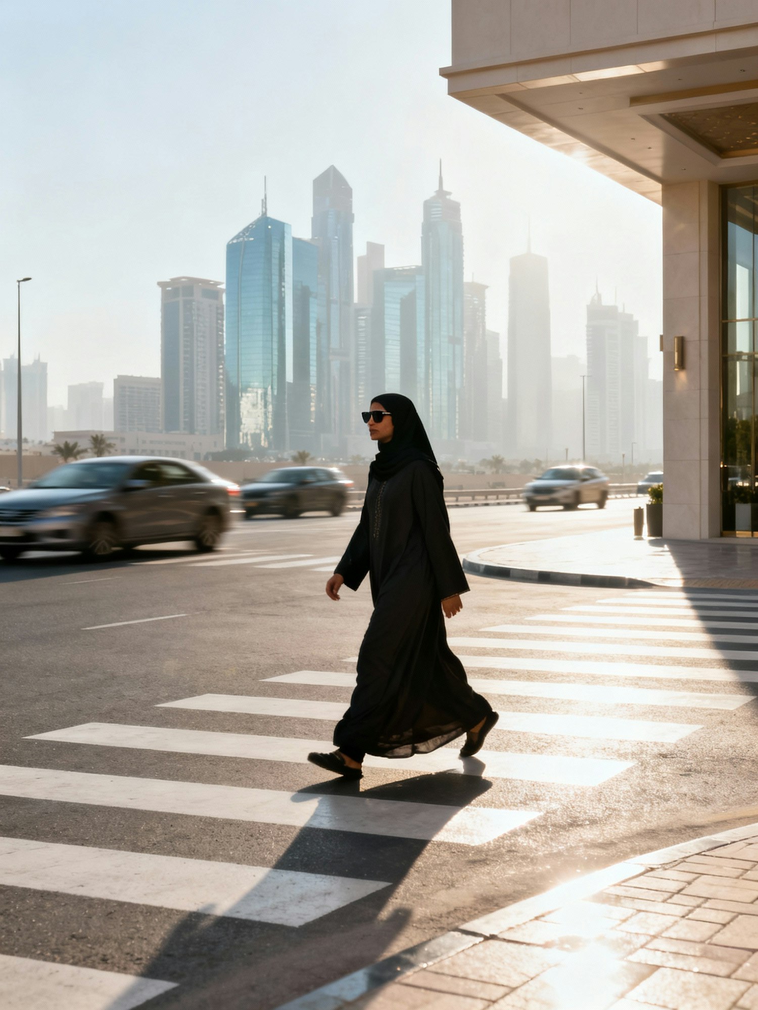 A woman in a black abaya crosses a city street with a modern skyline in the background, blending tradition and urban life.