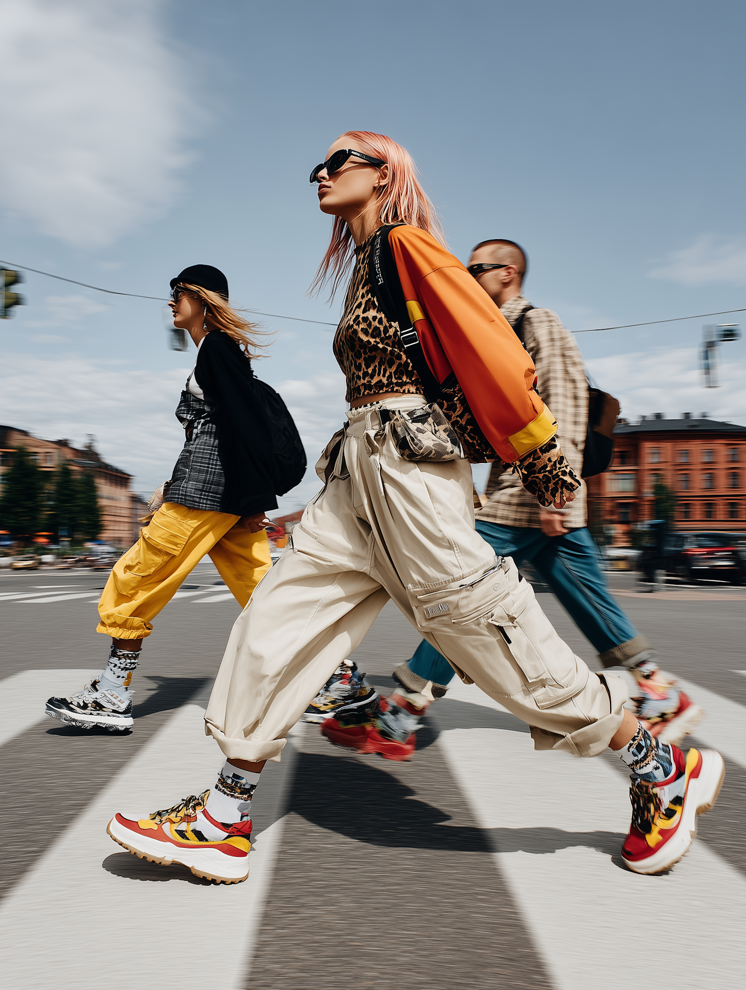 Three stylish individuals crossing a city street, showcasing vibrant fashion with bold colors and patterns under a clear blue sky.