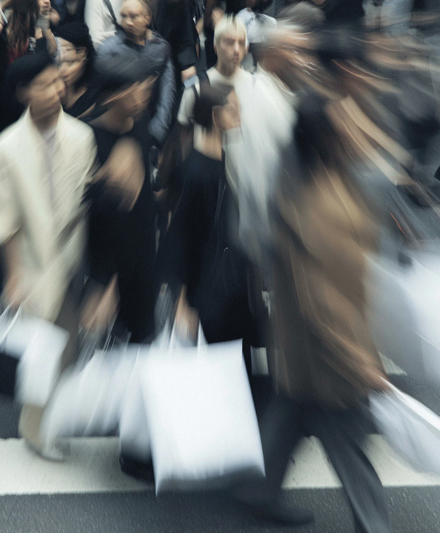 Blurred motion of a busy crowd crossing a street, carrying shopping bags, showcasing urban energy and dynamic movement.