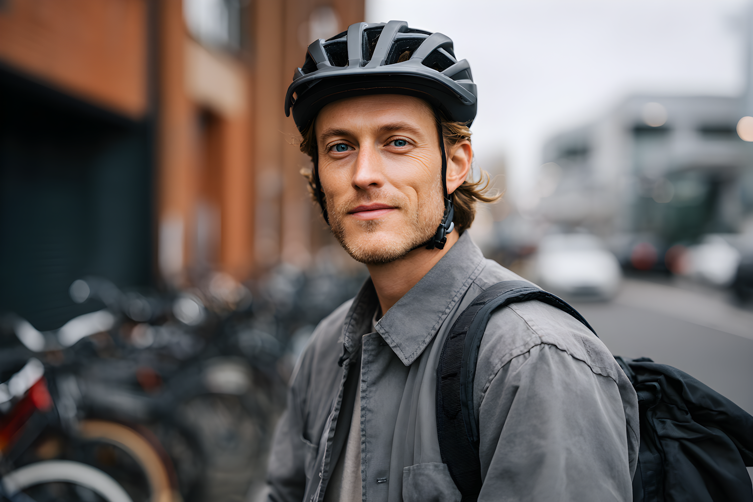 A man with a bicycle helmet and backpack stands in an urban setting with parked bikes and buildings in the background.