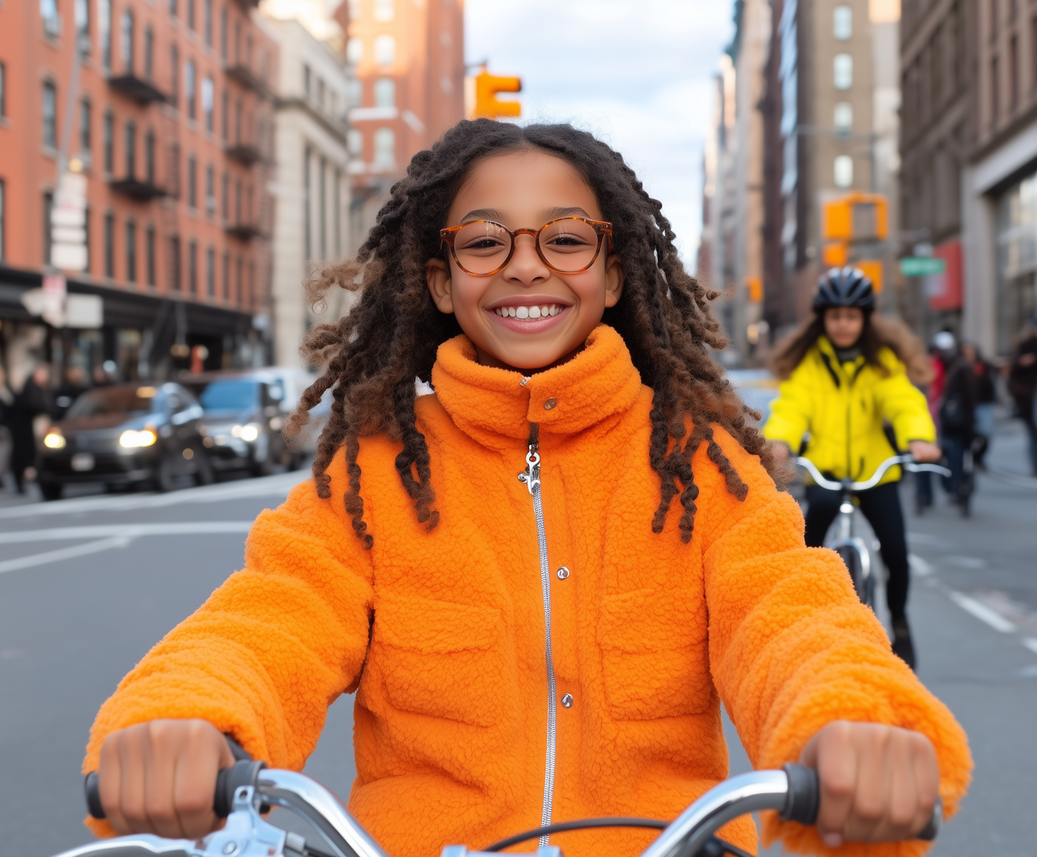 Cyclist in vibrant orange fleece rides through bustling city street, with another cyclist in neon yellow in the background.
