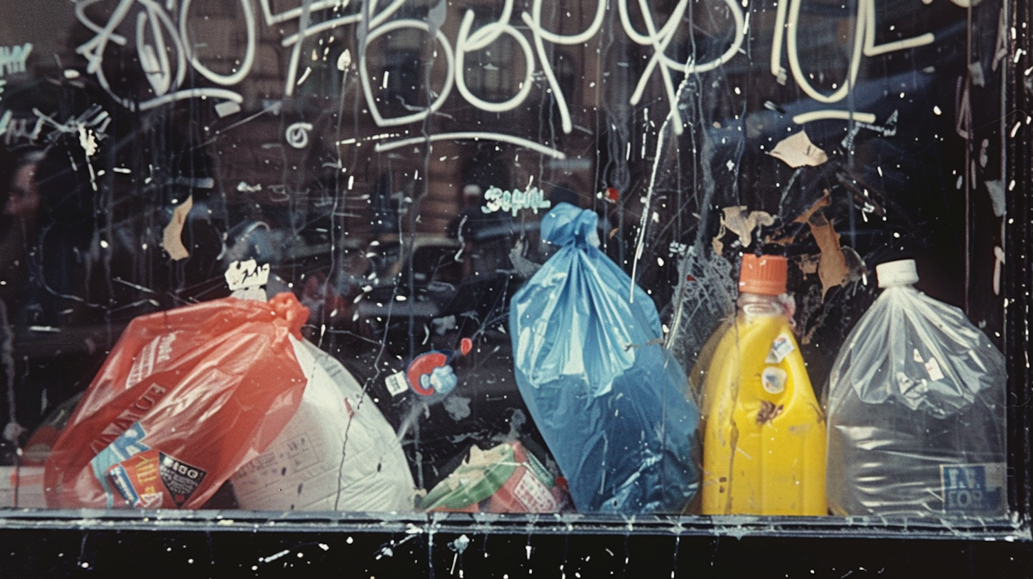 Urban window display with colorful bags, bottles, and graffiti, creating a gritty city vibe.