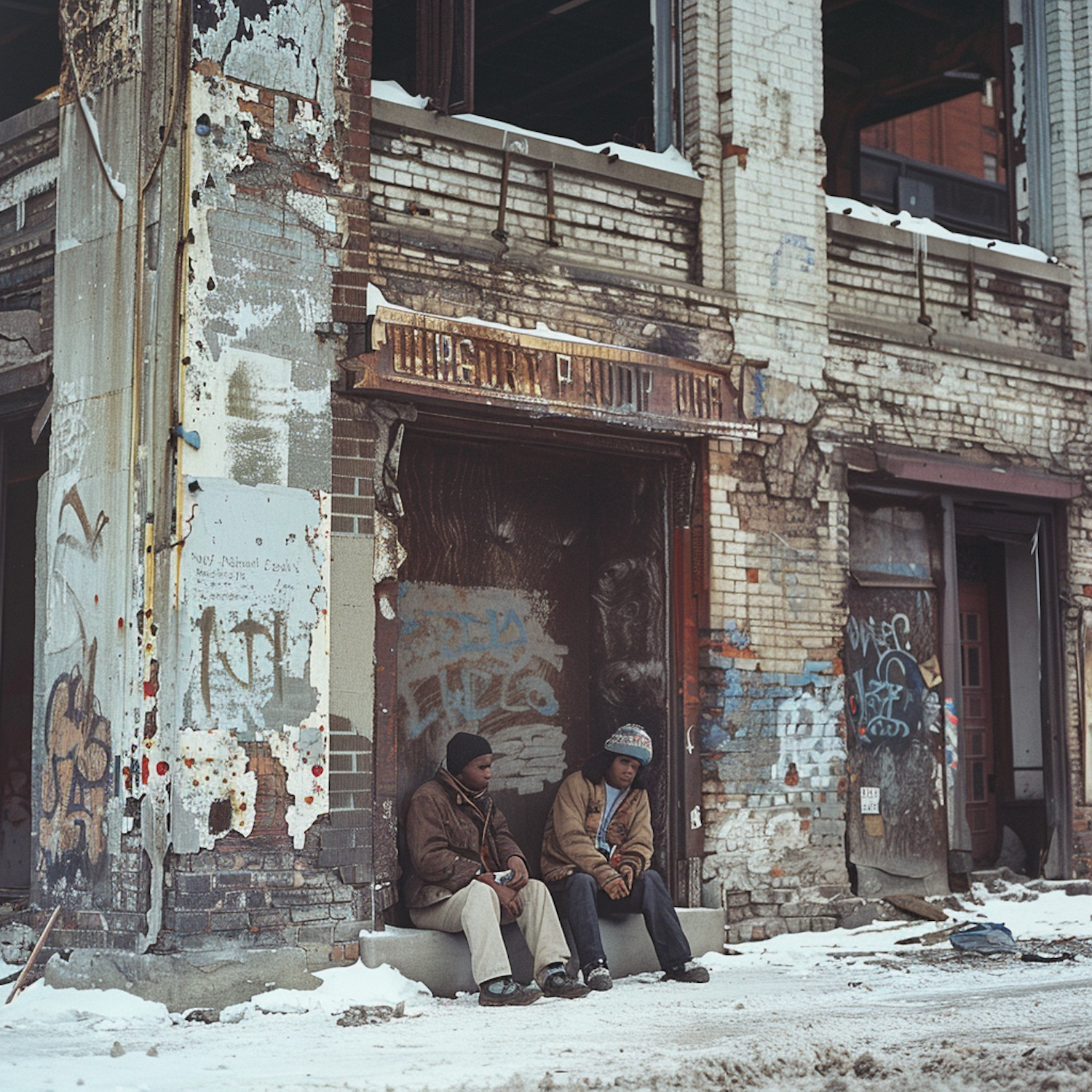 Two young men sit outside a graffiti-covered, abandoned building in winter, dressed warmly in jackets and hats, amidst urban decay.