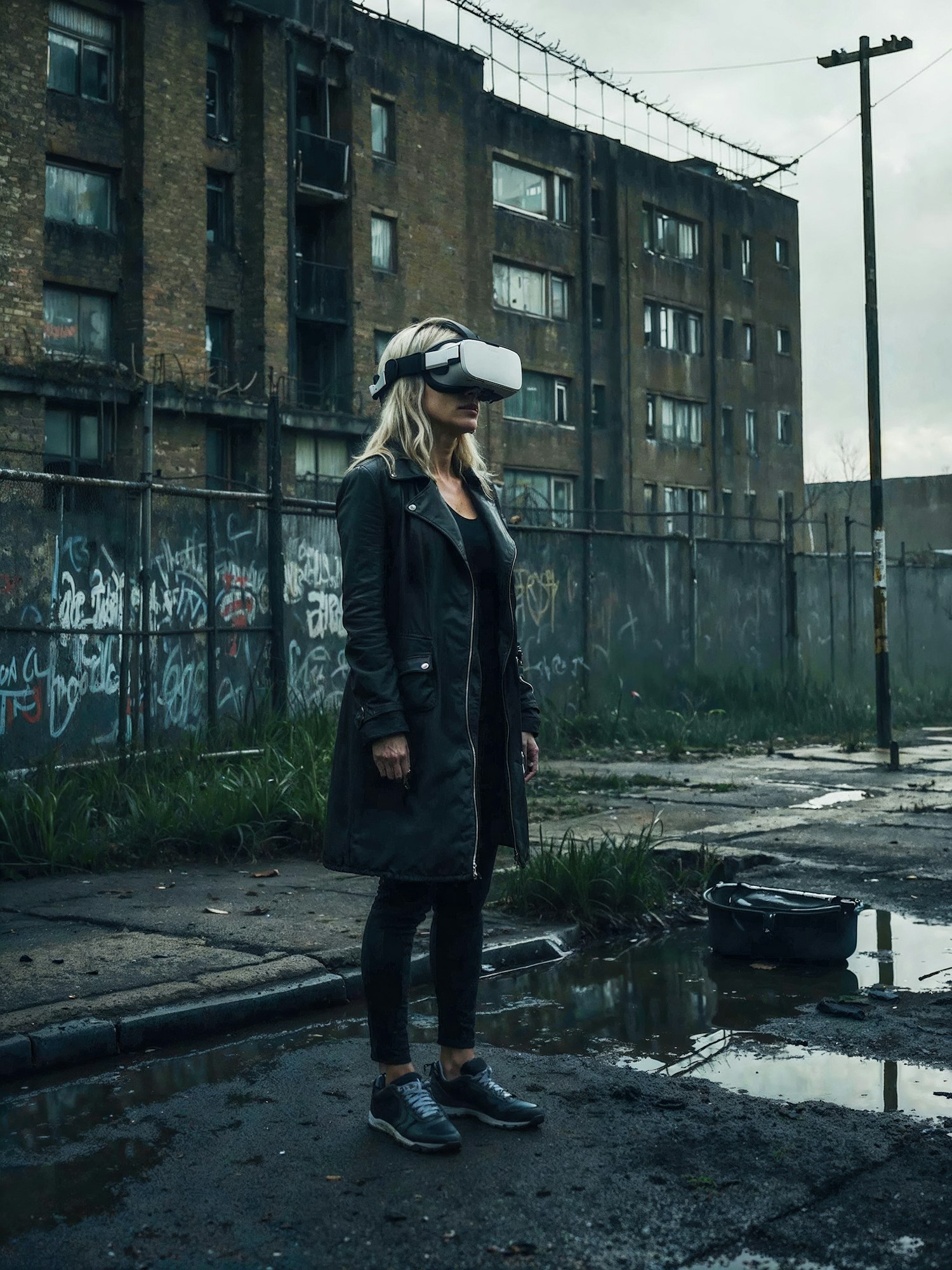 Woman in VR headset stands in a gritty urban setting with graffiti and rundown buildings, creating a stark contrast.