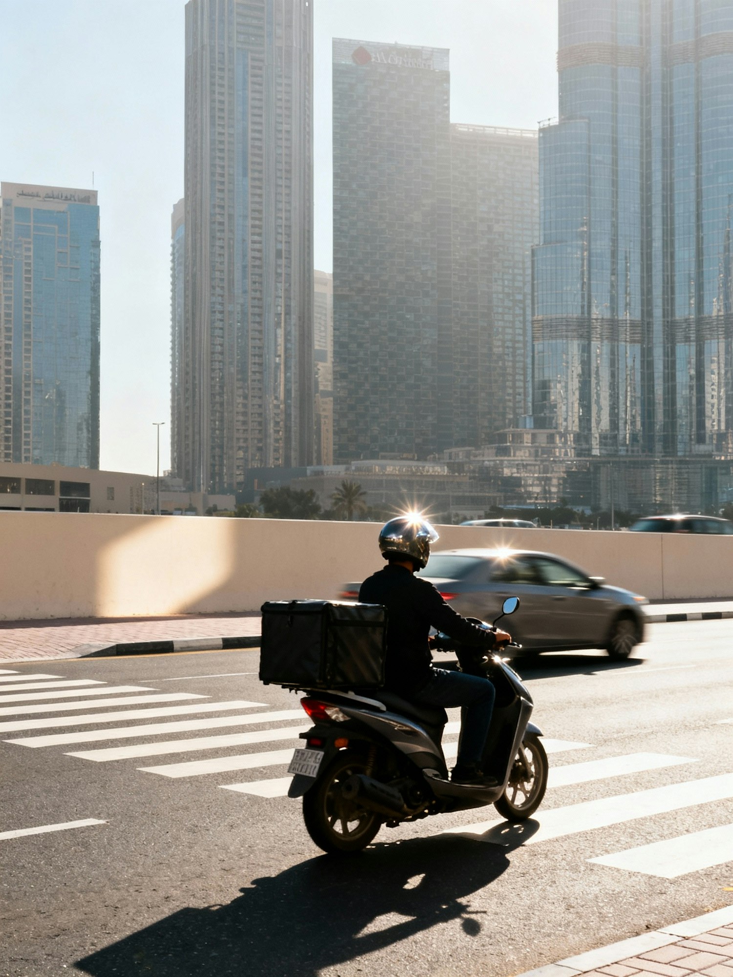 Bright late-morning on a service lane off Sheikh Zayed, clear sky, glass towers in soft haze; motorbike delivery rider stopped at a zebra line, head turned toward traffic, cars in background softly blurred; sun bouncing off pale pavement and bike helmet. 35 mm, 1/800 s, f/4, ISO 100, WB 5200 K; front-lit with gentle side fill from nearby light-colored wall. Negative: brand/hotel logos on buildings or boxes, overpolarized sky, HDR look.
