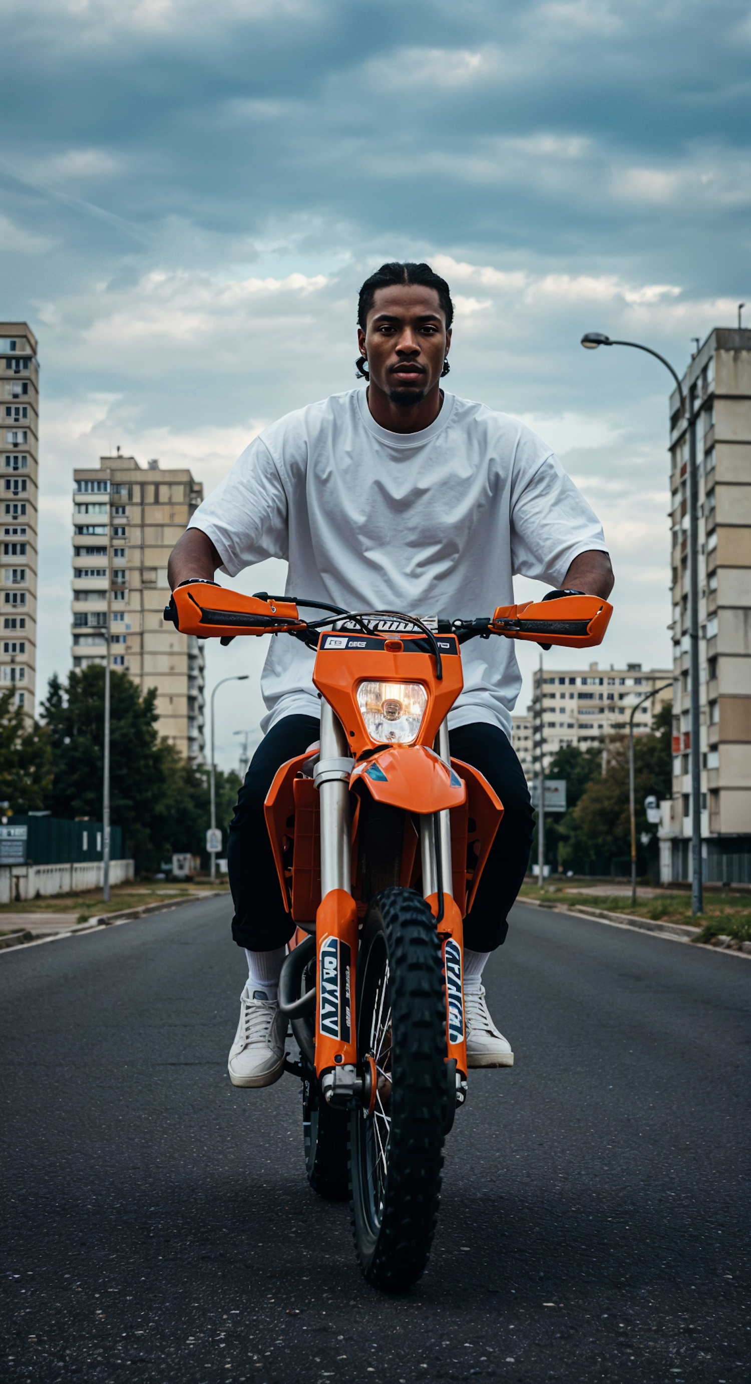 Man riding an orange dirt bike in an urban setting with overcast skies and tall buildings.