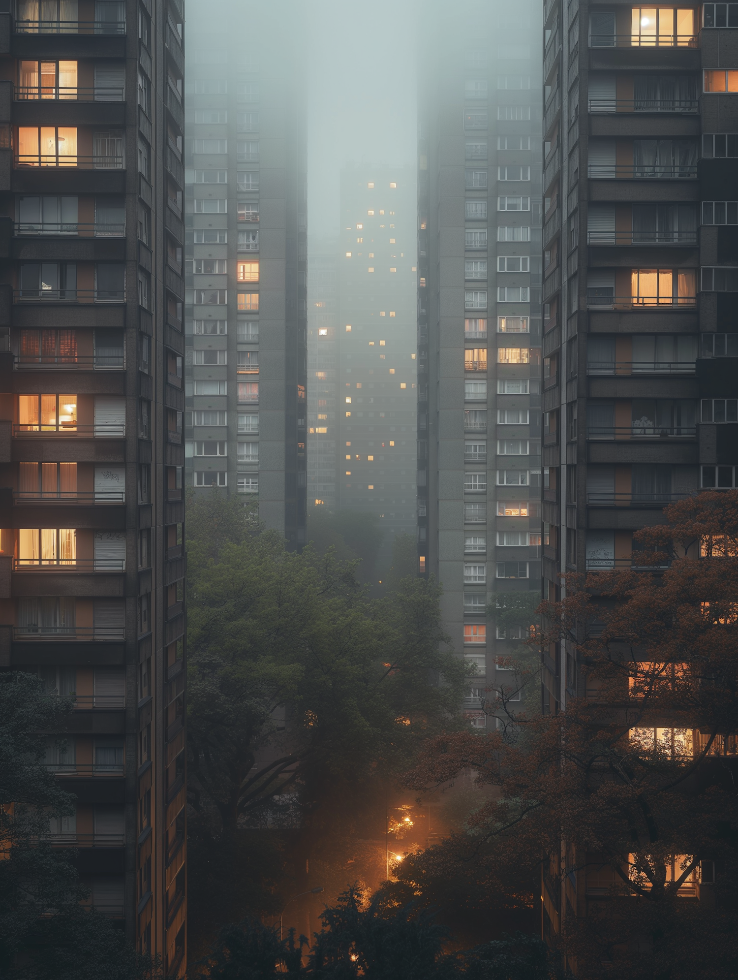 Foggy urban scene with glowing windows and streetlights between tall buildings, creating a serene and mysterious atmosphere.