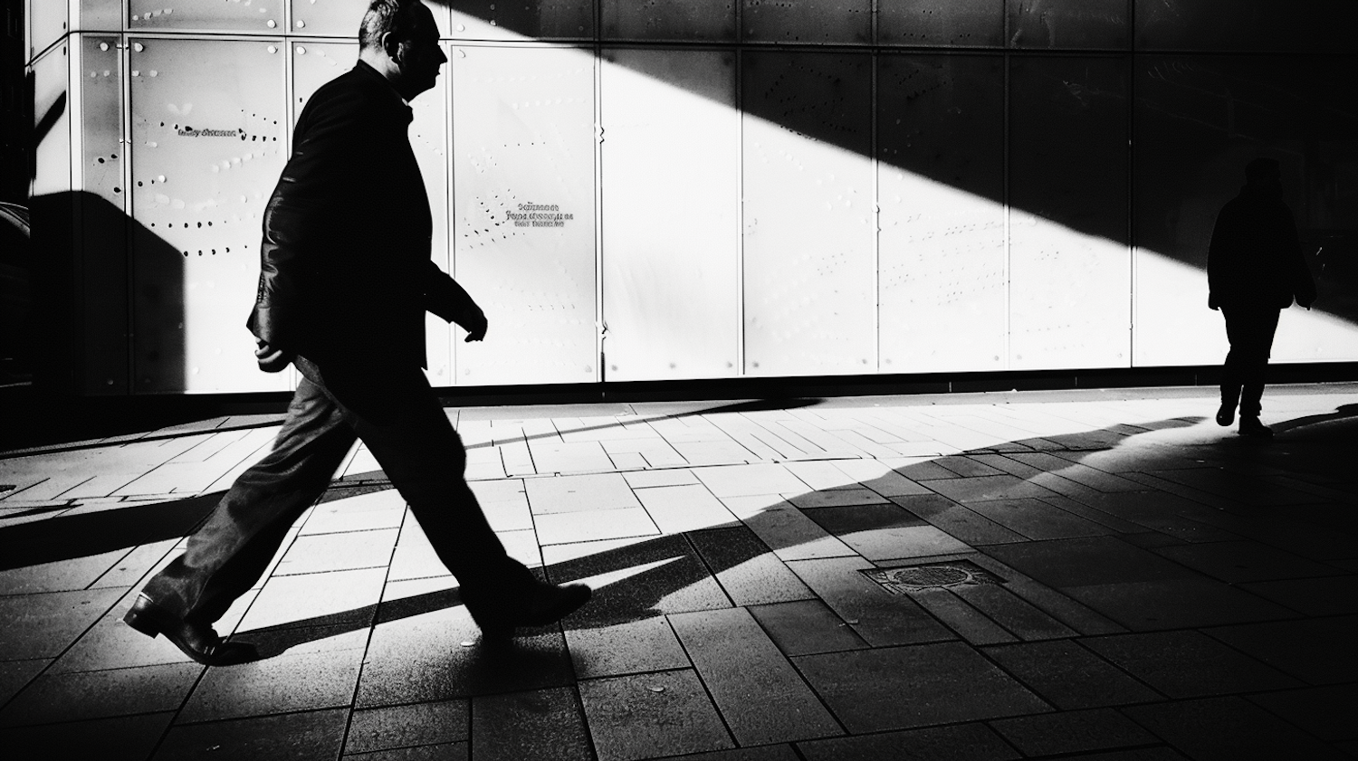 Black and white street scene with dramatic shadows, featuring a man walking past a modern building facade.