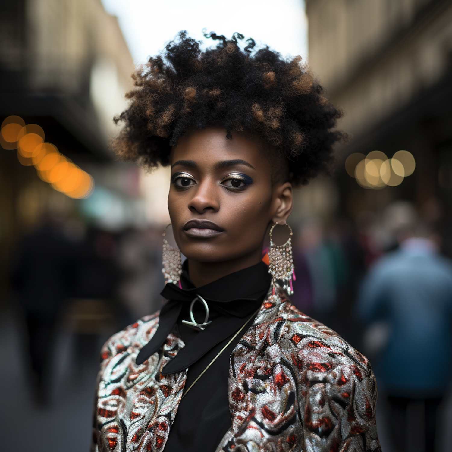 Stylish woman with afro and bold makeup in urban setting, wearing ornate earrings and patterned jacket. Blurred city lights in background.