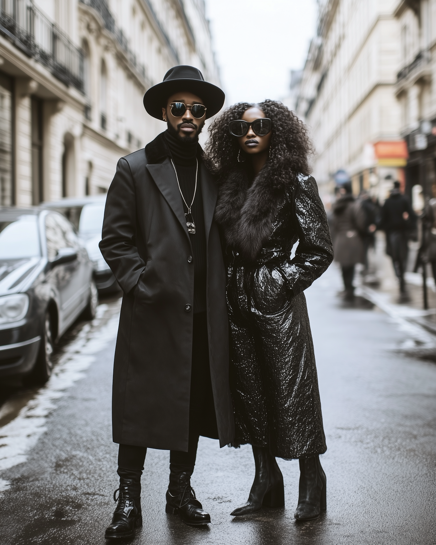 Stylish couple in black outfits on a city street, exuding modern elegance and confidence with chic accessories and urban backdrop.