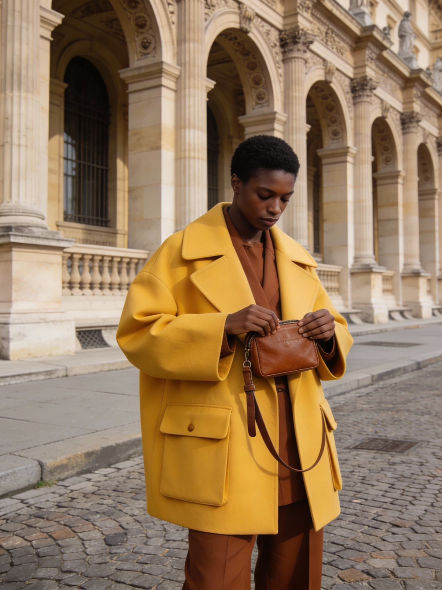A fashion-forward black individual stands on a cobblestone street in front of a grand classical building with arched columns and ornate stonework. They wear a bright yellow oversized coat with large lapels and flap pockets, layered over a brown outfit. The coat’s bold silhouette contrasts with the architectural backdrop, creating a striking visual. They hold a small brown leather bag with a strap, looking down at it in a quiet, composed gesture. The look blends contemporary volume with warm tones, set against a historic urban setting.