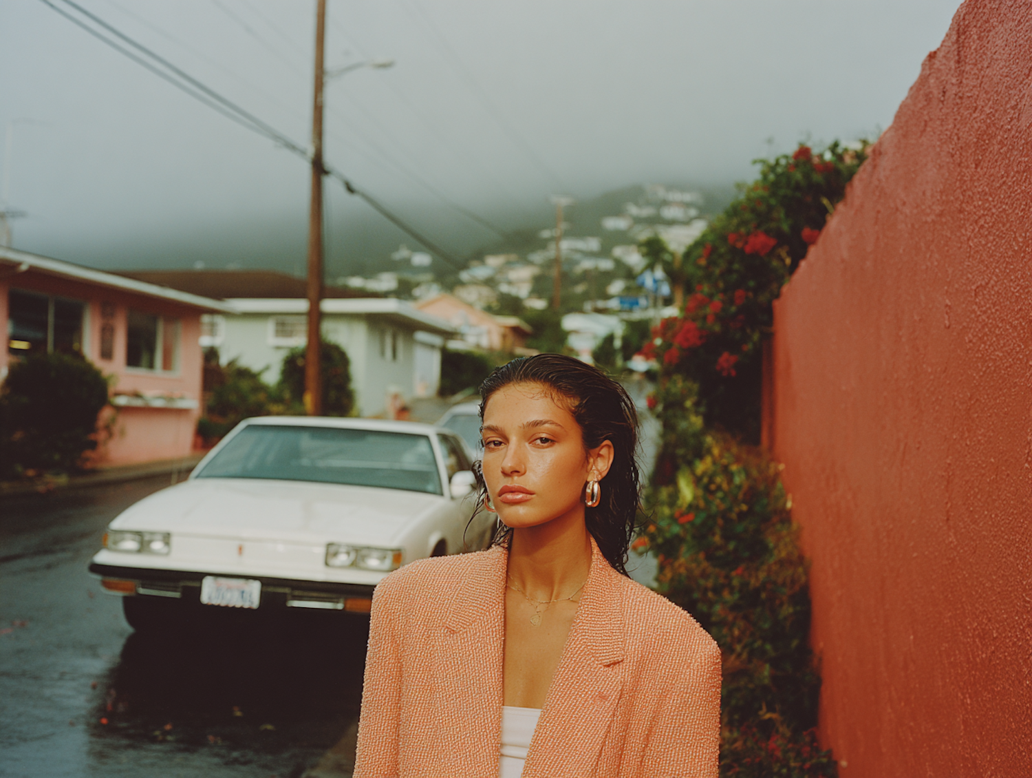 A stylish woman in a peach blazer stands on a misty street with a vintage car and colorful houses in the background.