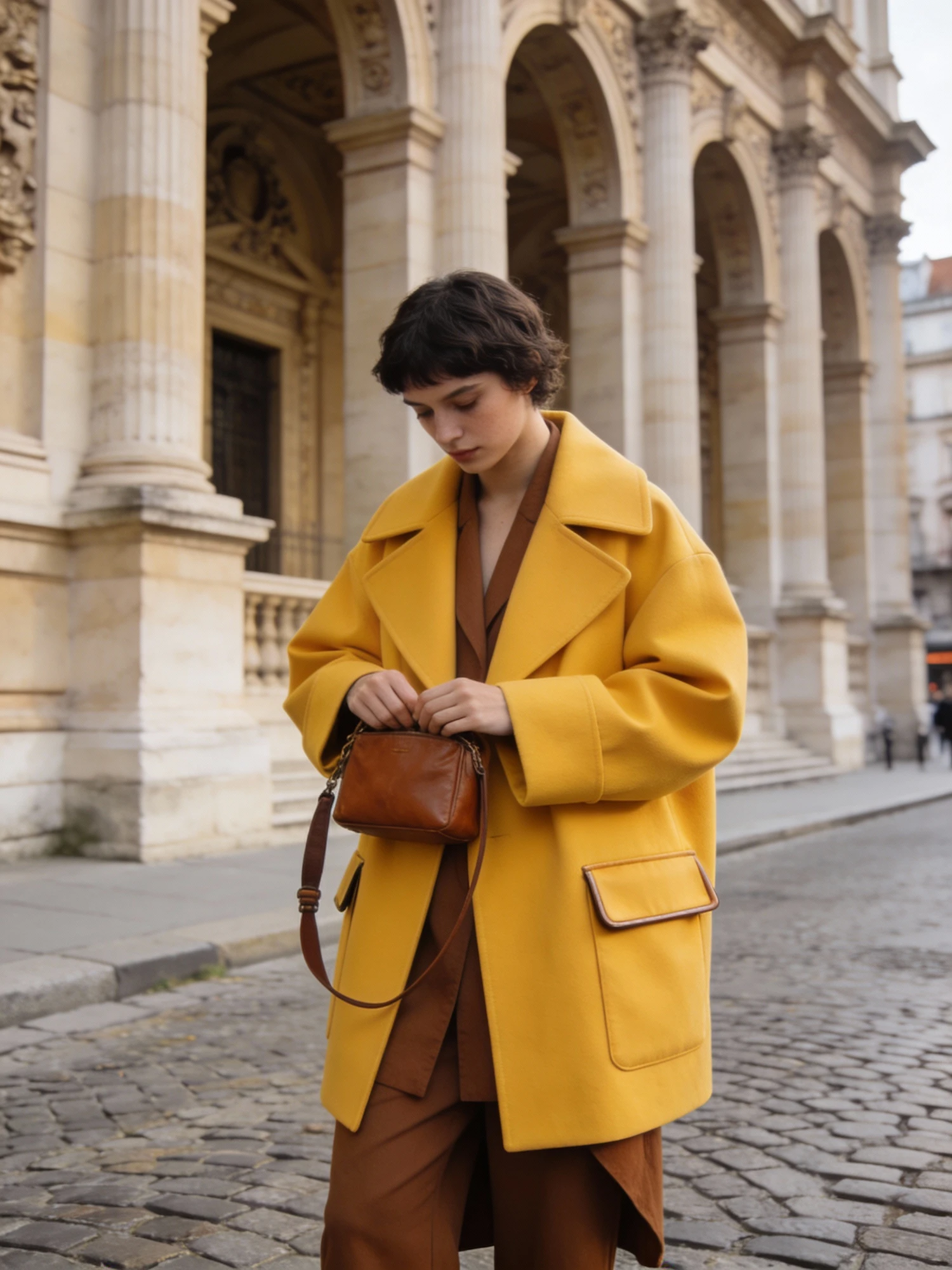 A fashion-forward individual stands on a cobblestone street in front of a grand classical building with arched columns and ornate stonework. They wear a bright yellow oversized coat with large lapels and flap pockets, layered over a brown outfit. The coat’s bold silhouette contrasts with the architectural backdrop, creating a striking visual. They hold a small brown leather bag with a strap, looking down at it in a quiet, composed gesture. The look blends contemporary volume with warm tones, set against a historic urban setting.