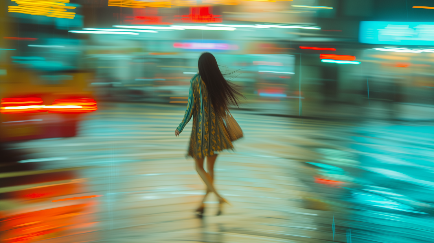 A woman in a striped dress walks through a vibrant, blurred cityscape at night, with colorful lights reflecting off wet streets.