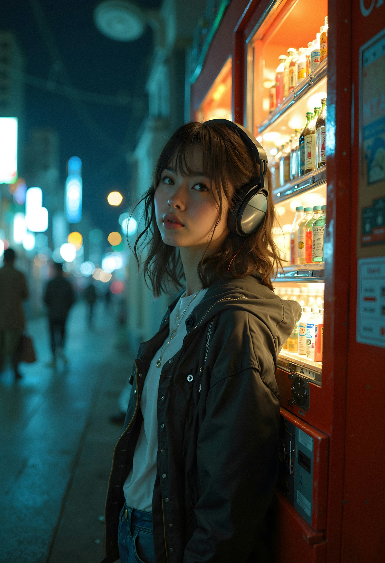 Young woman with headphones leans against a glowing vending machine at night, surrounded by dreamy urban lights.