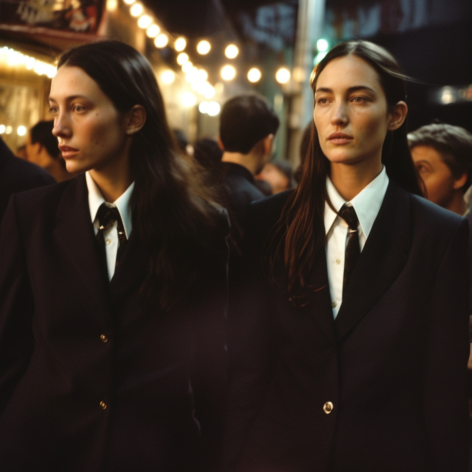 Two individuals in formal suits walk through a lively, warmly lit urban setting, creating a striking contrast with their serious expressions.