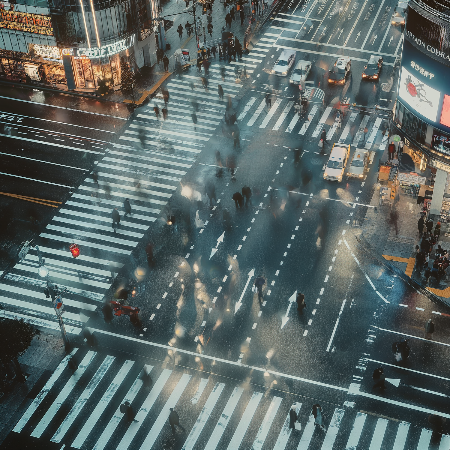 A vibrant city intersection at night with blurred pedestrians, illuminated crosswalks, and bright billboards creating a dynamic urban scene.