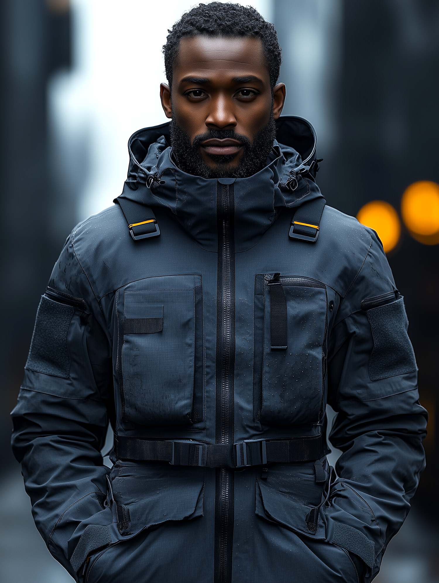 Stylish Black man in a tactical jacket stands confidently in a moody urban setting, showcasing modern fashion and urban style.