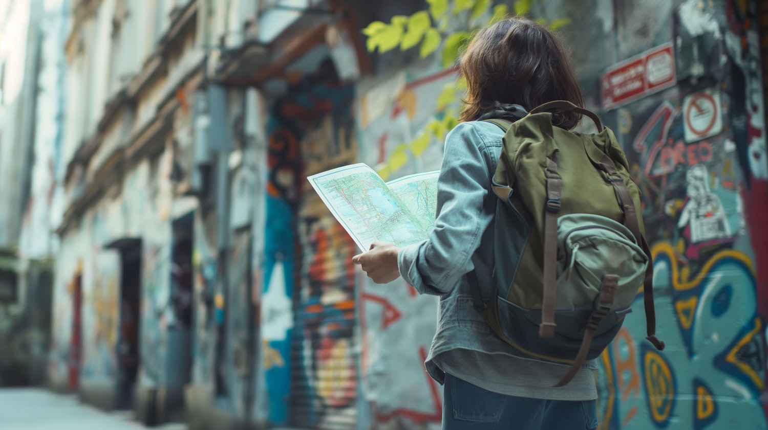 Traveler with a map explores a graffiti-filled urban alley, wearing a denim jacket and backpack, capturing a sense of adventure.