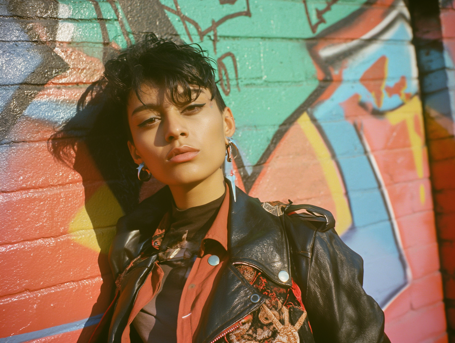 Confident individual in a leather jacket poses against a vibrant graffiti wall, exuding edgy urban style and bold self-expression.